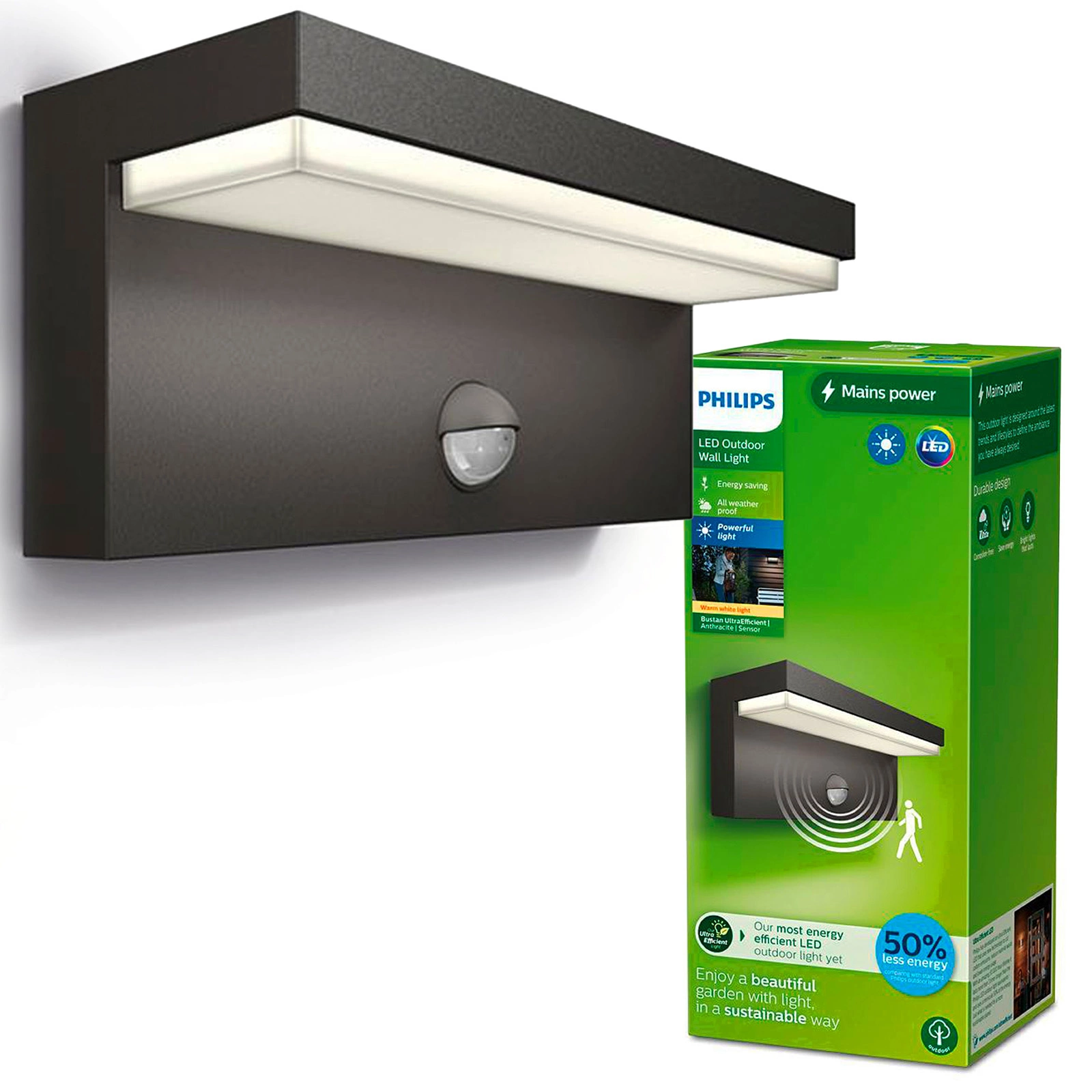 Wir stellen die Bustan Ultra Efficient LED Outdoor Façade Wall Lamp von Philips vor - die ideale Lösung für alle, die eine moderne und energieeffiziente Außenbeleuchtung suchen. Mit einer Leistung von 3,8 W und einem Lichtstrom von 800 Lumen bietet diese LED-Wandleuchte warmes, angenehmes Licht mit einer Farbtemperatur von 2700 K, das sich perfekt in die Gartenarchitektur einfügt. Ausgestattet mit einem intelligenten Bewegungs- und Dämmerungssensor, passt die Wandleuchte ihren Betrieb automatisch an und sorgt so für Energieeinsparungen und Komfort. Die Schutzart IP44 garantiert Witterungsbeständigkeit und macht sie zu einer idealen Wahl für den Außenbereich. Mit ihrer anthrazitfarbenen Farbe und ihrem modernen Design fügt sich die Leuchte perfekt in jede Fassadengestaltung ein und verleiht ihr Eleganz und Funktionalität. Mit einer Lebensdauer von bis zu 50.000 Stunden und einer minimalen Einschaltzeit von 1 Sekunde ist diese Lampe ein Symbol für Langlebigkeit und Leistung und damit eine zuverlässige Wahl für jeden anspruchsvollen Nutzer.