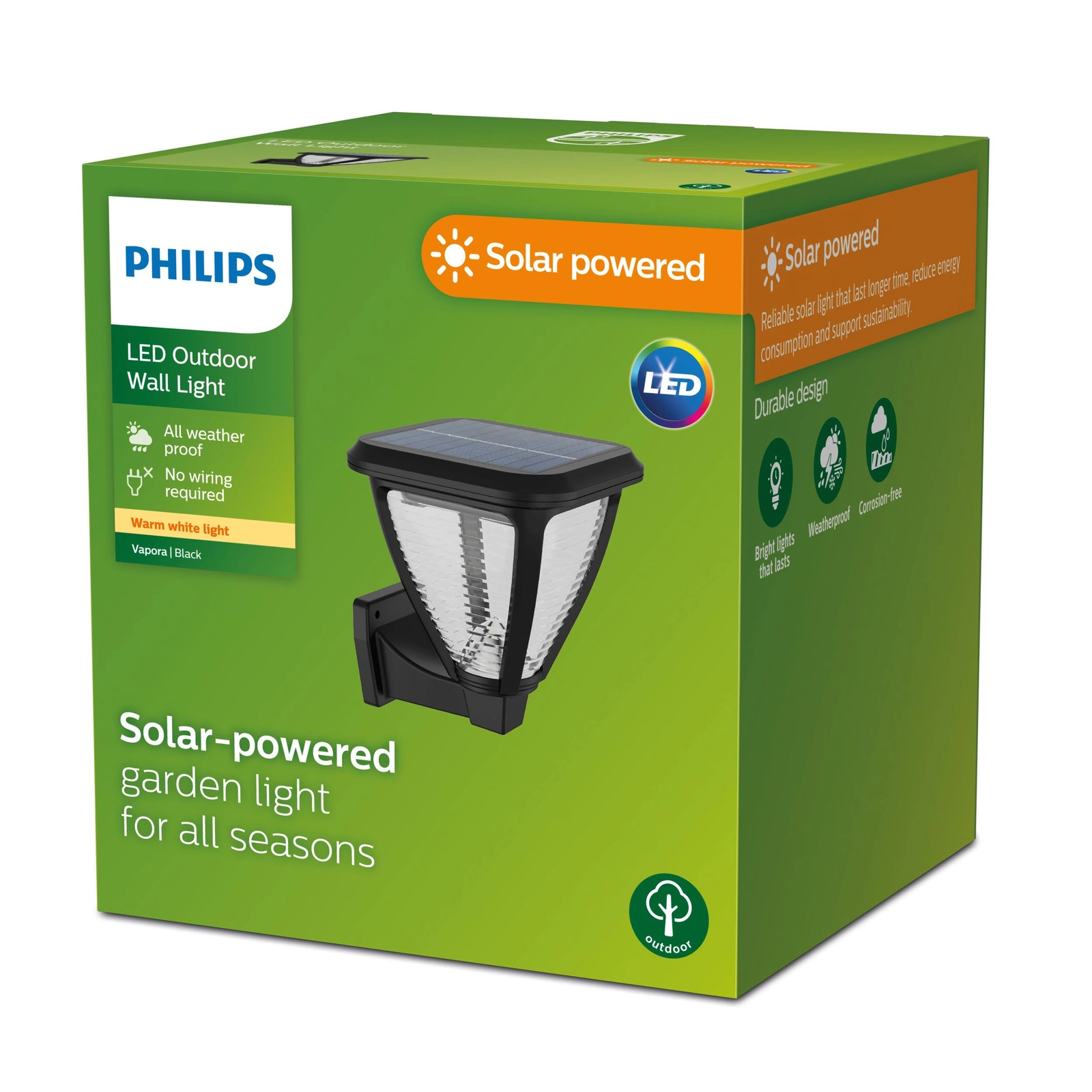 Entdecken Sie die moderne Gartenwandleuchte von Philips - die Vapora. Diese Solarlampe für den Außenbereich wurde mit Blick auf Ästhetik und Funktionalität entwickelt und bietet die perfekte Beleuchtungslösung für Ihren Außenbereich. Ausgestattet mit einer energieeffizienten 1,5-W-LED erzeugt sie einen Lichtstrom von 200 Lumen und eine warme Lichtfarbe von 2700 K, die eine angenehme Atmosphäre in Ihrem Garten schafft. Das schwarze Gehäuse fügt sich perfekt in moderne Fassaden ein und verleiht jedem Ambiente Eleganz und Stil. Das Produkt zeichnet sich durch seine lange Lebensdauer von bis zu 15.000 Stunden aus, was einen dauerhaften Einsatz garantiert. Durch die hohe IP-Schutzart kommt die Leuchte auch mit widrigen Witterungsbedingungen gut zurecht und garantiert Langlebigkeit und Zuverlässigkeit. Dank des integrierten Solarpanels ist die Wandleuchte energieeffizient und umweltfreundlich, was sie zu einer idealen Wahl für alle macht, die modernes Design in Kombination mit ökologischen Lösungen schätzen.