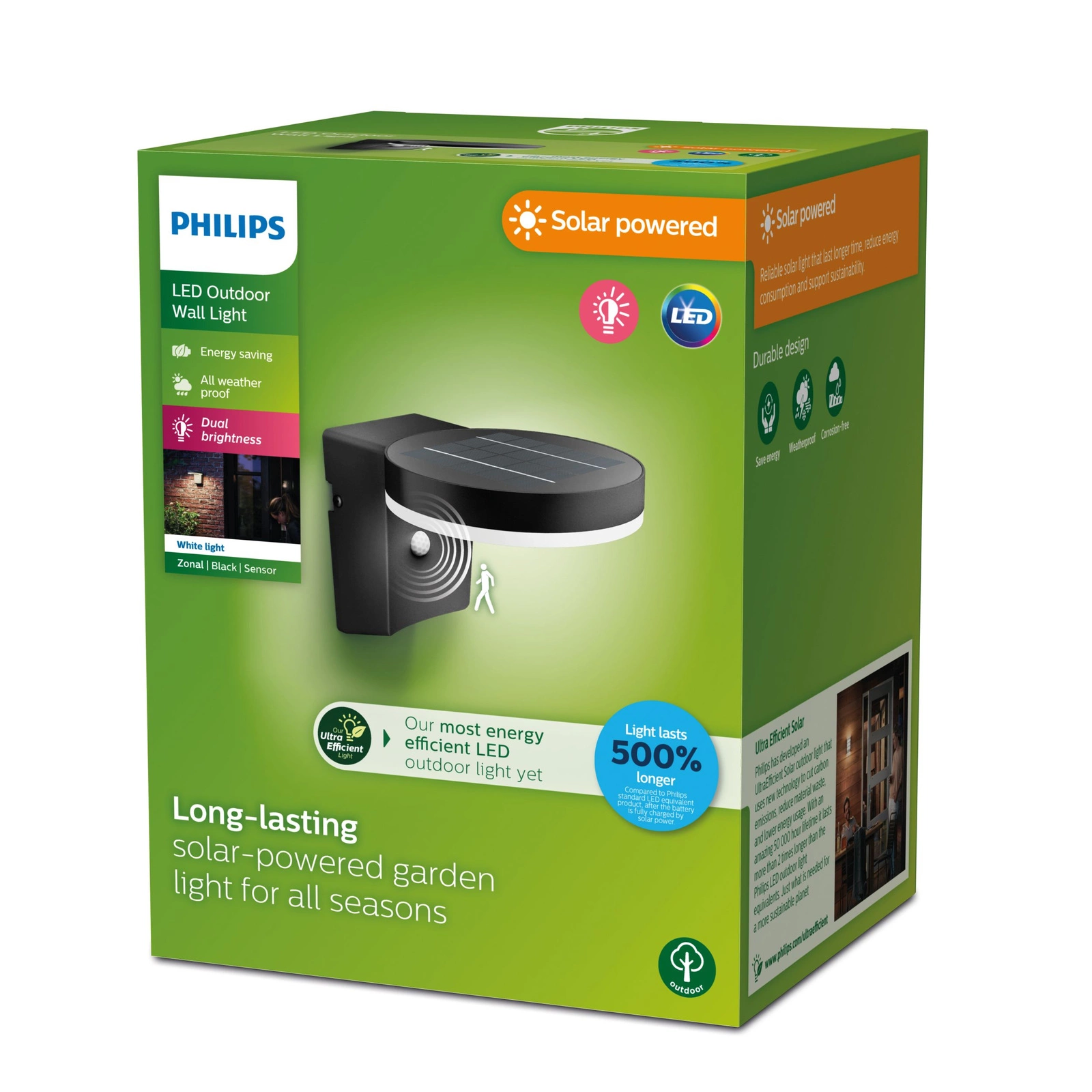 Die LED Outdoor Solar Façade Wall Lamp von Philips ist die perfekte Lösung für alle, die eine moderne Außenbeleuchtung suchen, die Energieeffizienz und stilvolles Design vereint. Die effiziente und umweltfreundliche 1,3-W-Lampe erzeugt einen Lichtstrom von 250 Lumen in einer warmen Farbe von 3000 K, die das natürliche Tageslicht perfekt reflektiert. Ausgestattet mit einem Bewegungs- und Dämmerungssensor sorgt sie für ein automatisches Ein- und Ausschalten in Abhängigkeit von der Tageszeit und der Anwesenheit von Personen. Das schwarze, moderne Gehäuse fügt sich perfekt in die verschiedenen Gestaltungen von Außenbereichen ein, egal ob sie an Fassaden, in Gärten oder auf Terrassen installiert ist. Die Langlebigkeit der Leuchte wird durch bis zu 50.000 Betriebsstunden gewährleistet, was bedeutet, dass man viele Jahre mit dem Produkt zufrieden sein kann, ohne es häufig austauschen zu müssen. Diese Wandleuchte ist ein Synonym für Modernität, Langlebigkeit und intelligente Beleuchtungslösungen, die den Bedürfnissen der heutigen Nutzer gerecht werden.