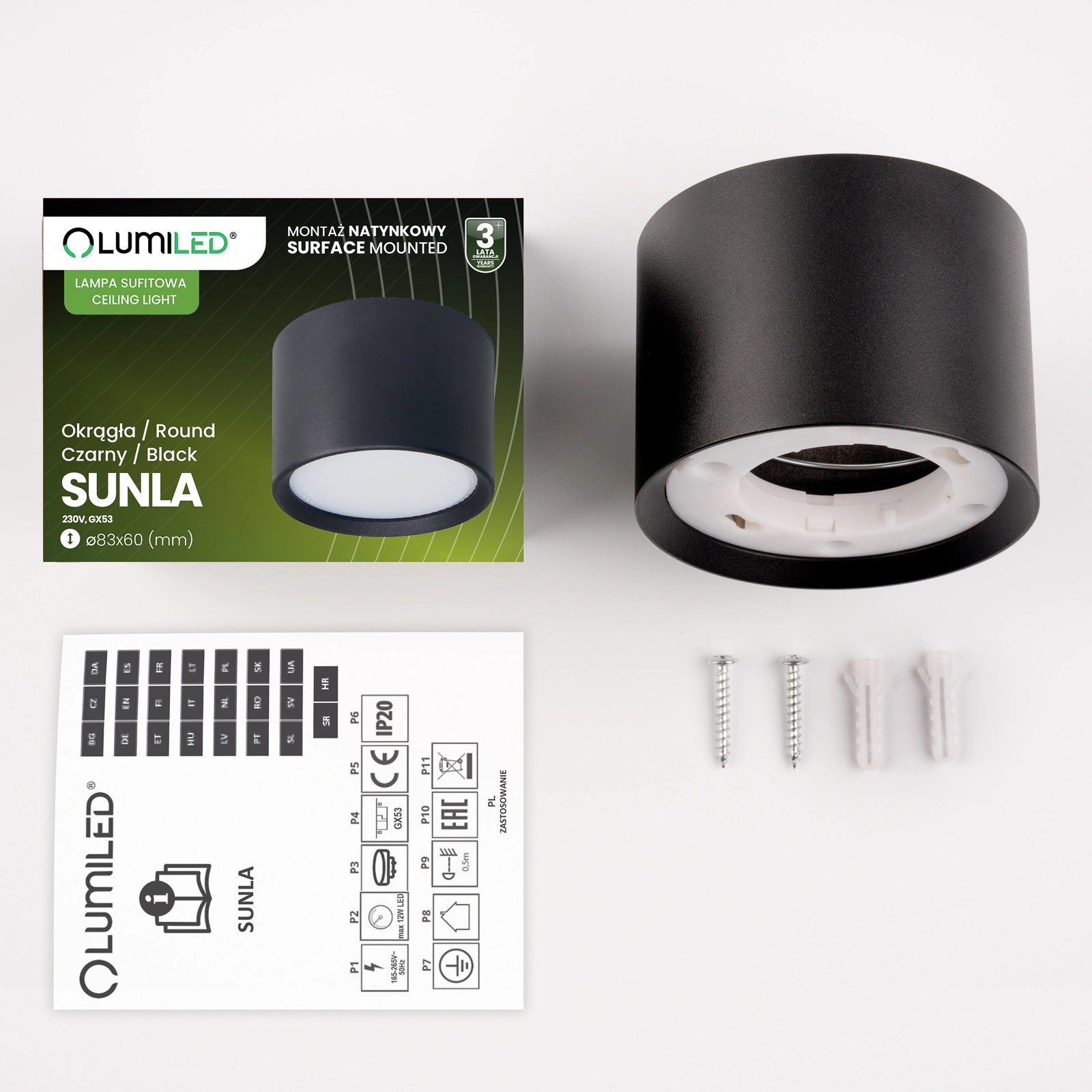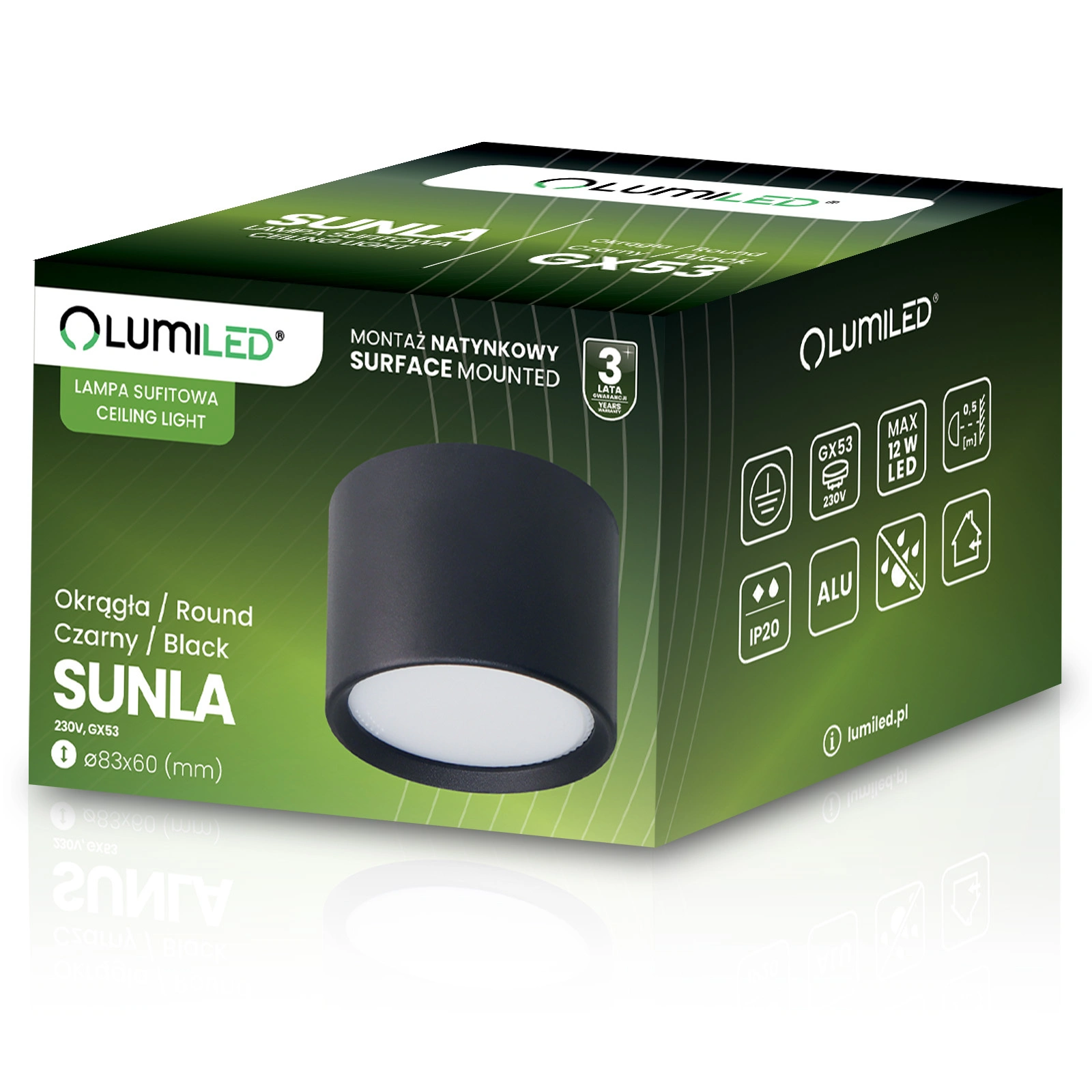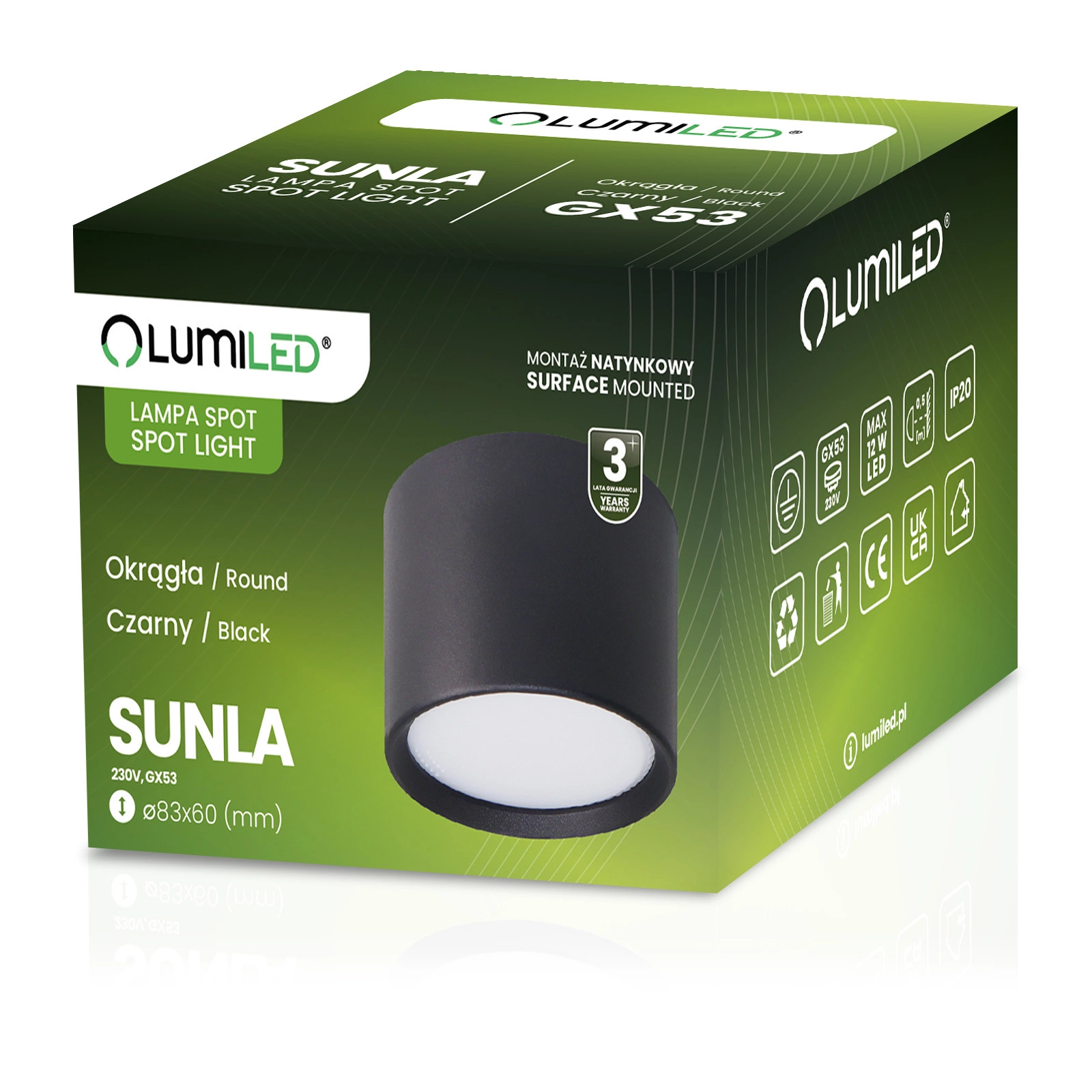 Die Leuchte ist mit einem GX53-Schraubsockel (Gewinde) ausgestattet, der es ermöglicht, je nach Bedarf LED- und herkömmliche Glühbirnen mit der entsprechenden Leistung und Lichtfarbe zu wählen. Die maximale Leistung der Lichtquelle darf jedoch 12 W LED nicht überschreiten.