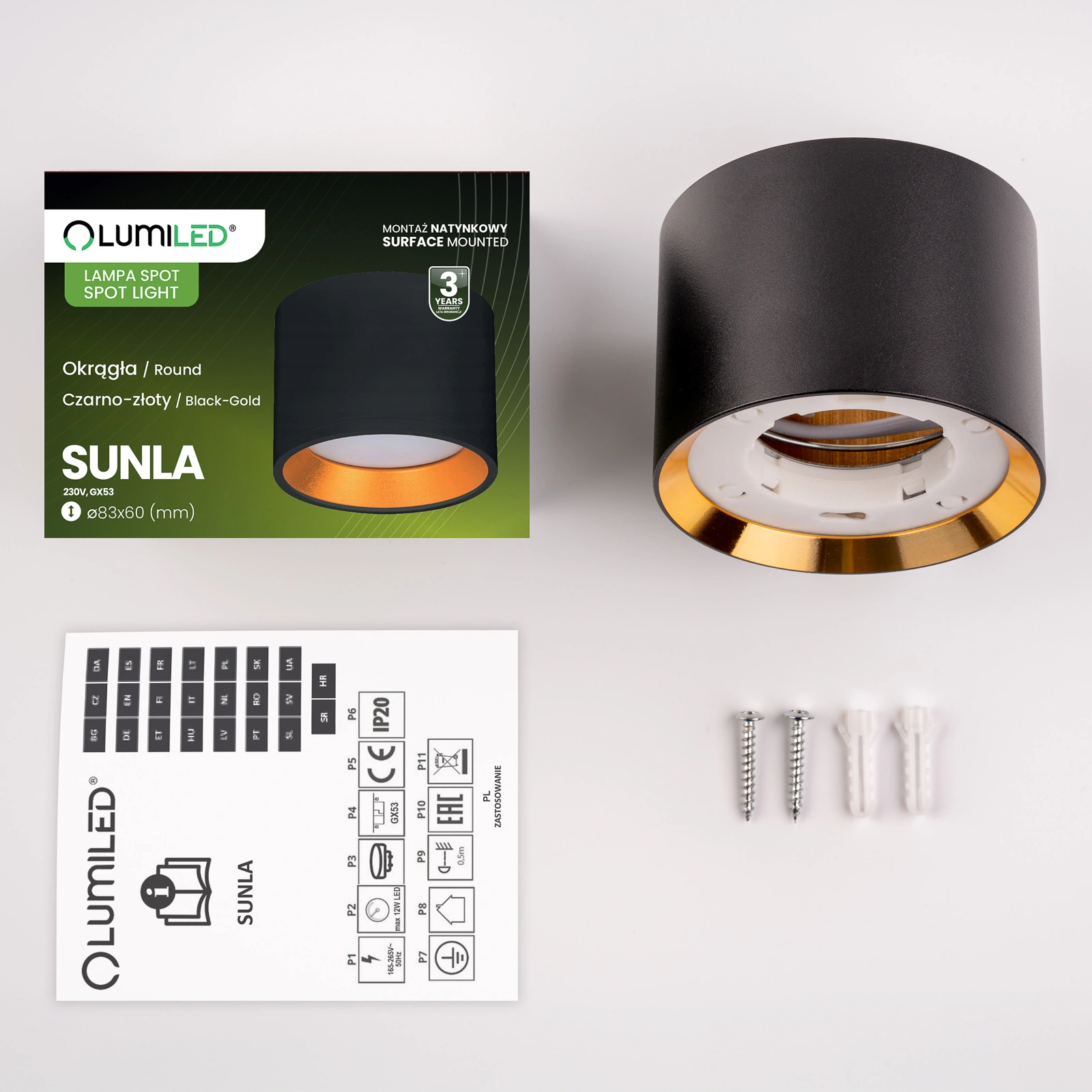 Die Leuchte ist mit einem GX53-Schraubsockel (Gewinde) ausgestattet, der es ermöglicht, je nach Bedarf LED- und herkömmliche Glühbirnen mit der entsprechenden Leistung und Lichtfarbe auszuwählen, wobei die maximale Leistung der Lichtquelle 12 W LED nicht überschreiten darf.