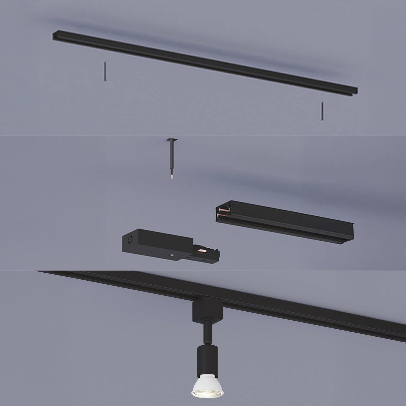 Der Bausatz ist für eine schnelle Aufbaumontage und eine einfache Erweiterung des Systems in der Zukunft konzipiert. Dank der EasyLink-Kompatibilität kann die Installation mit zusätzlichen Schienen, Strahlern und Verbindern erweitert werden, was eine völlige Freiheit bei der Lichtgestaltung ermöglicht. Die schwarze Farbgebung trägt zur allgemeinen Eleganz bei und sorgt dafür, dass das System auch bei einer Änderung der Inneneinrichtung optisch konsistent bleibt.
