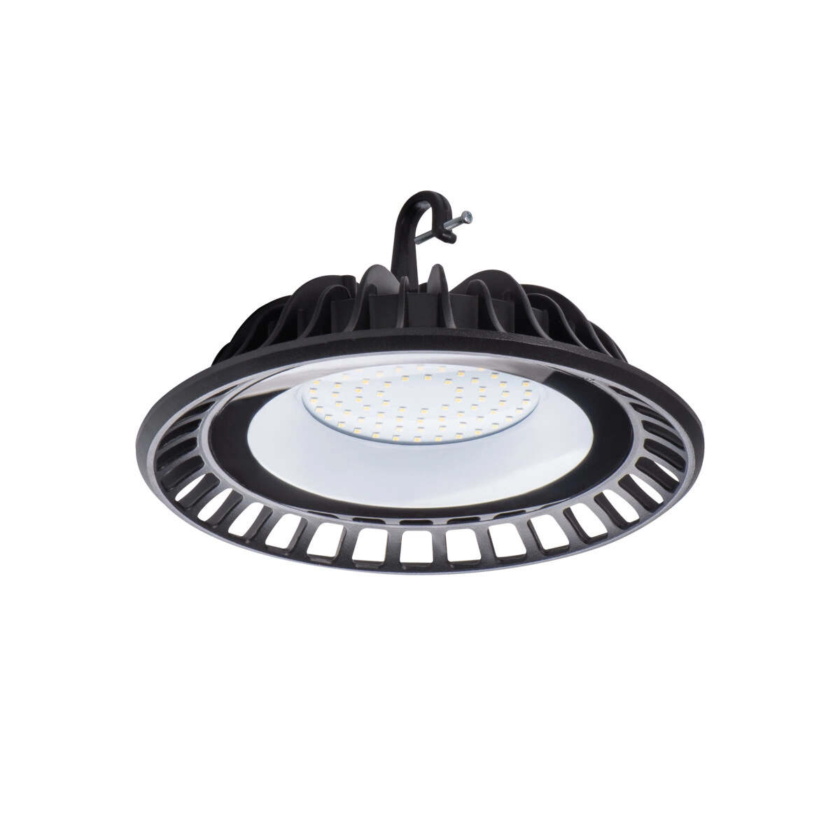 Die kompakte 50-W-Lampe HIBO HIGH BAY erzeugt 4750 lm Licht in einer Farbe von 4000 K. Die Schutzart IP65 schützt vor Staub und Wasser, und das schwarze Gehäuse sorgt für einen vielseitigen Look.