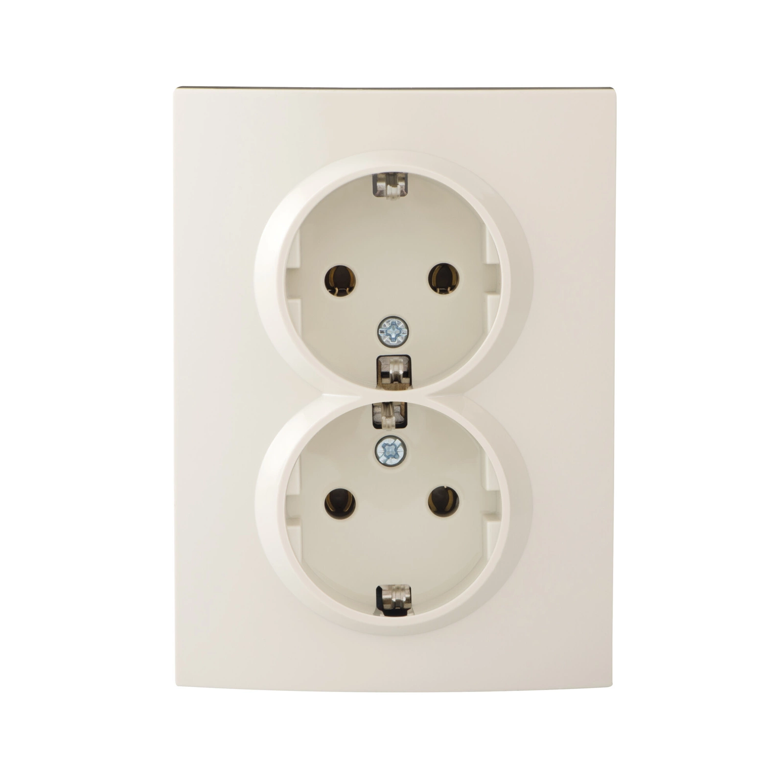 Funktionelle Doppelsteckdose LOGI in Cremefarbe, kompatibel mit Schuko-System. Bietet die Möglichkeit, zwei Geräte mit einer maximalen Stromstärke von 16 A anzuschließen.