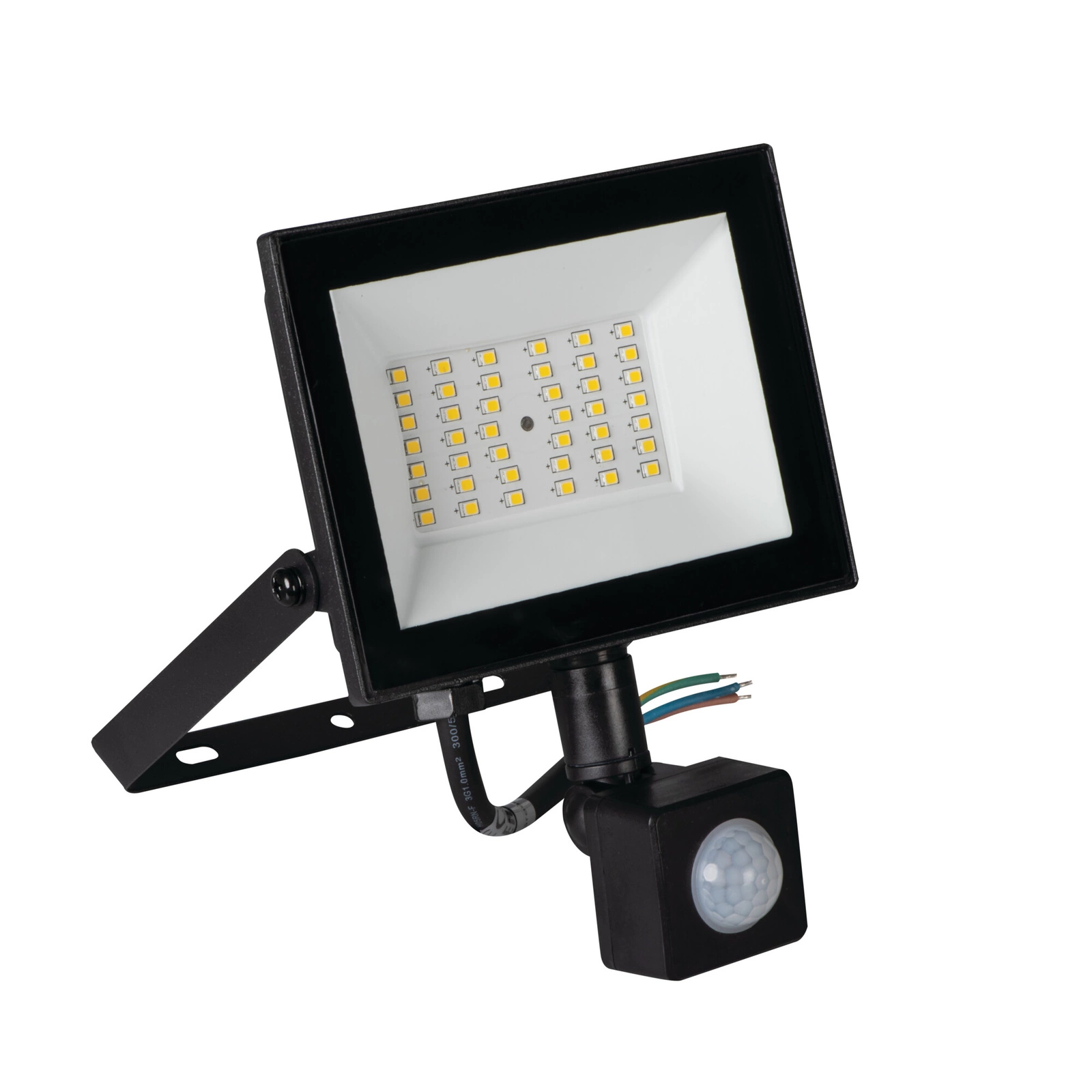 GRUN LED-Flutlicht mit Bewegungssensor 30W 2650lm 4000K IP65 Schwarz bietet eine hervorragende Beleuchtung für Außenbereiche und erzeugt 2650 Lumen bei 30W. Der Bewegungssensor schaltet das Flutlicht automatisch ein, wenn er eine Bewegung erkennt, was Energie spart und die Sicherheit erhöht. Mit der Schutzart IP65 ist der Scheinwerfer wasser- und staubdicht und eignet sich somit für raue Wetterbedingungen wie Regen oder starken Wind. Sein schwarzes Gehäuse verleiht ihm ein modernes Aussehen und seine hohe Energieeffizienz garantiert einen lang anhaltenden Betrieb.