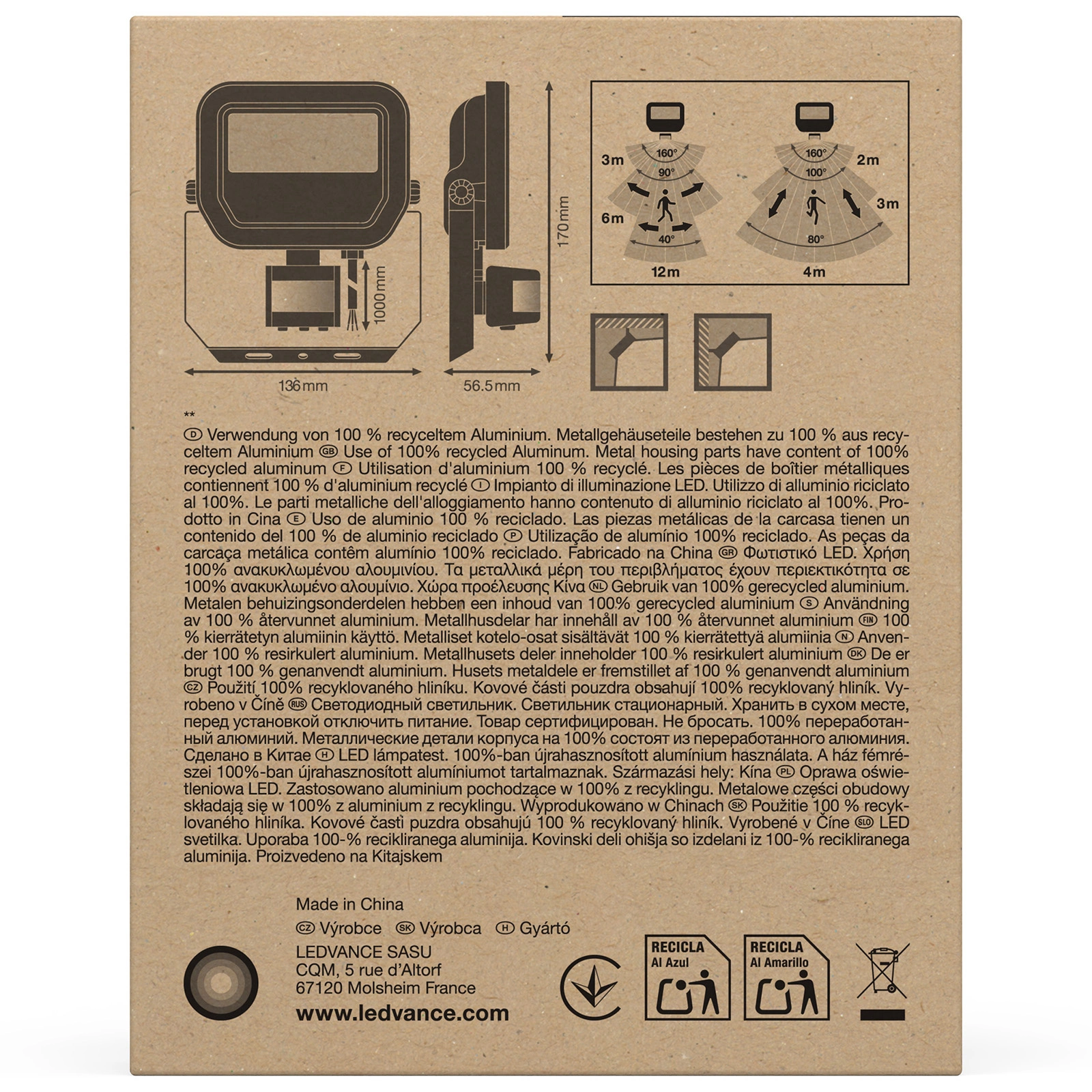 LEDVANCE-Flutlicht mit Bewegungsmelder ist mit einer energiesparenden LED-Lichtquelle von 17W. Lampe strahlt neutral licht mit einer Farbtemperatur 4000K die einen Lichtstrom von bis zu 2400lm. Gehärtetes Milchglas sorgt für eine gleichmäßige Lichtausbreitung. Der LEDVANCE LED-Halogen ist ein innovatives Gerät, das auch im Außenbereich eingesetzt werden kann, z.B. zur Beleuchtung von Garagen, Hausfassaden oder Einfahrten.