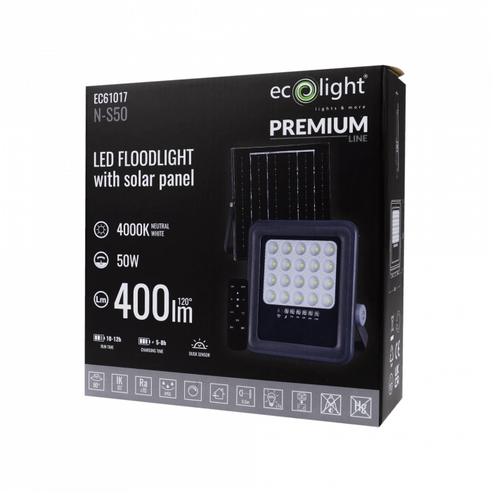 LED-Flutlicht Solar Reflektor 50W 900lm 4000lm Neutral IP65 mit Dämmerungssensor + Ecolight Fernbedienung