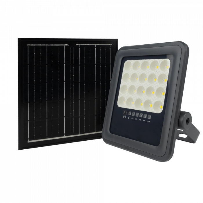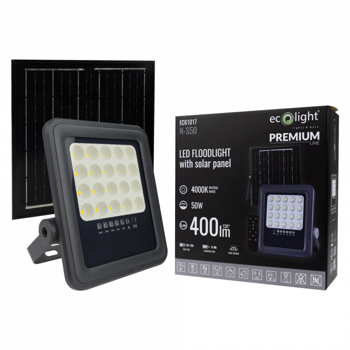 Entdecken Sie eine energieeffiziente Beleuchtungslösung mit dem 50W Ecolight LED-Flutlicht, das durch ein Solarpanel betrieben wird. Mit einer Helligkeit von 900 lm ist die Beleuchtung intensiv und effektiv, was ihn zu einer idealen Wahl für Bereiche wie Gärten, Terrassen oder Wege macht. Der Fluter strahlt mit einer Farbtemperatur von 4000K ein neutralweißes Licht aus, das sich harmonisch in die natürliche Umgebung einfügt. Mit einem integrierten Dämmerungssensor und einer Fernbedienung bietet das Gerät Funktionalität und Komfort für den täglichen Gebrauch.