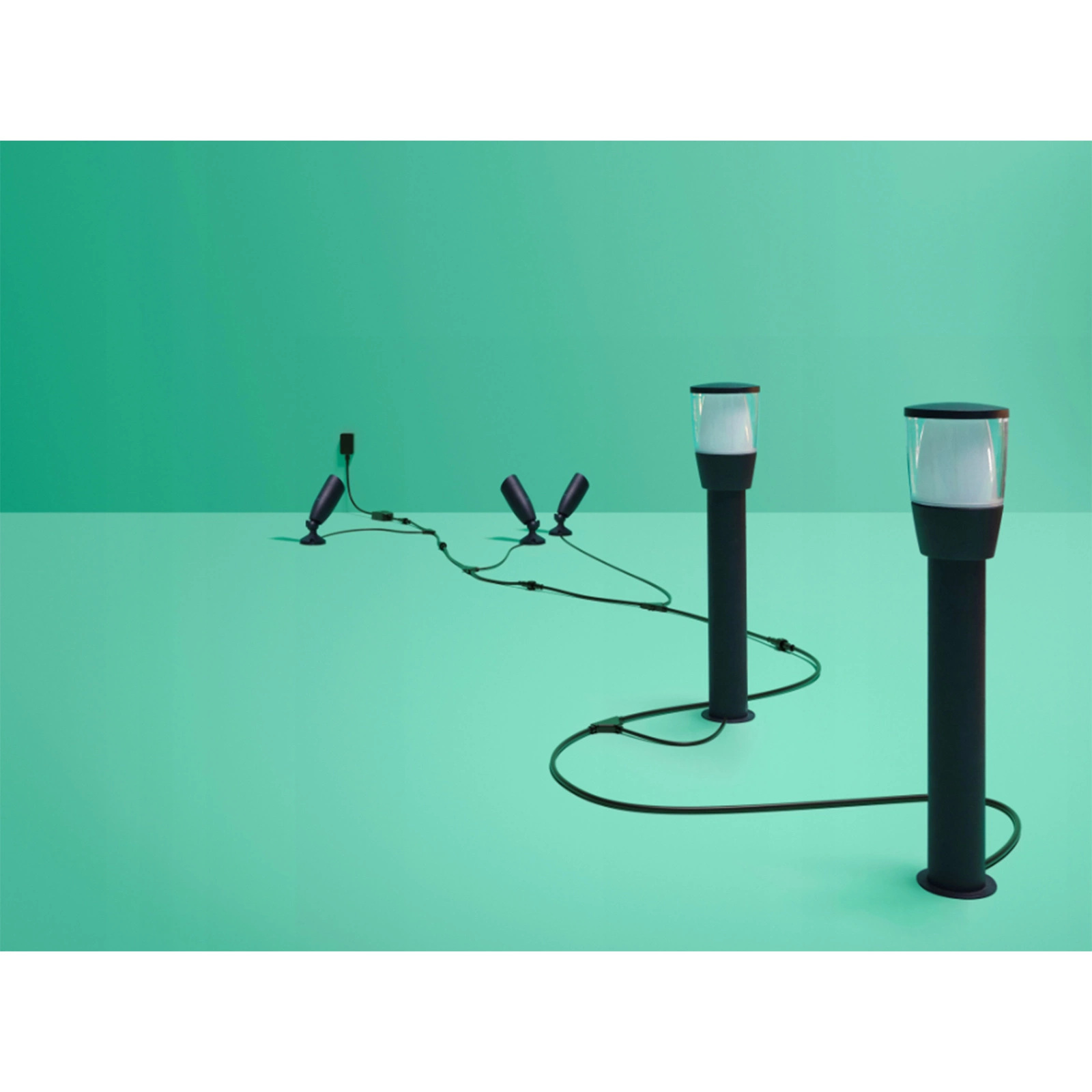 Die Kabel sind witterungsbeständig und durch den modularen Aufbau lässt sich das Set leicht um zusätzliche Lampen erweitern. Es ist die ideale Lösung für alle, die Komfort, Ästhetik und intelligente Lichtsteuerung miteinander verbinden möchten.