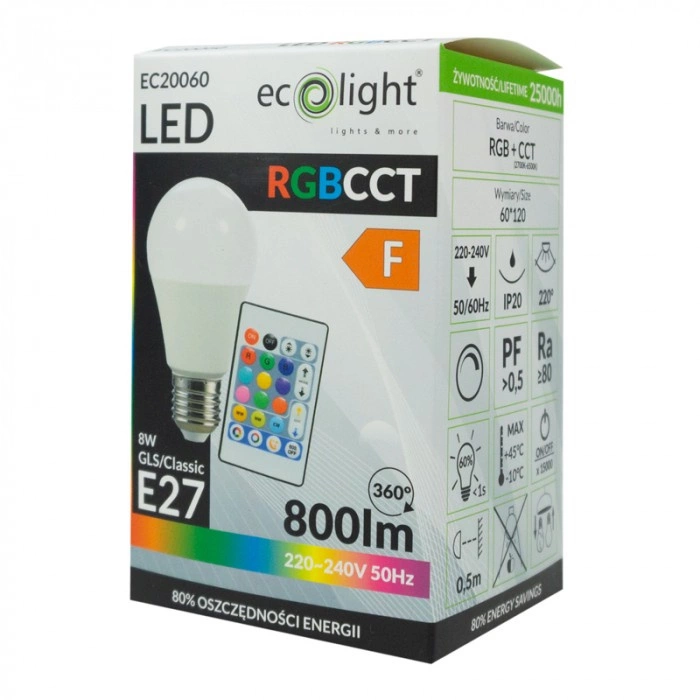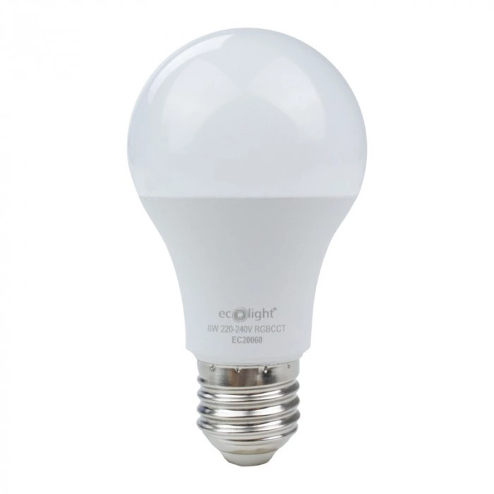 Entdecken Sie ein unvergleichliches Ambiente in Ihrem Zuhause mit der 8W A60 E27 LED-Lampe von Ecolight. Diese mehrfarbige Glühbirne mit Dimmfunktion und RGB-Farbwechselfunktion gibt Ihnen die volle Kontrolle über die Beleuchtung Ihres Raumes. Mit der mitgelieferten Fernbedienung können Sie die Intensität und die Farbe des Lichts ganz einfach einstellen und so eine Stimmung schaffen, die perfekt zu jedem Anlass passt. Mit einer Lebensdauer von bis zu 20.000 Stunden und einer Effizienz von bis zu 100 lm/W ist dies ein Produkt, das Innovation und Energieeinsparung vereint.