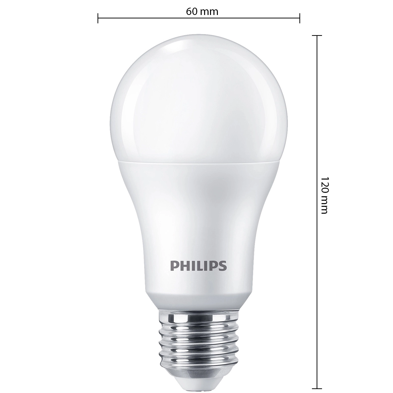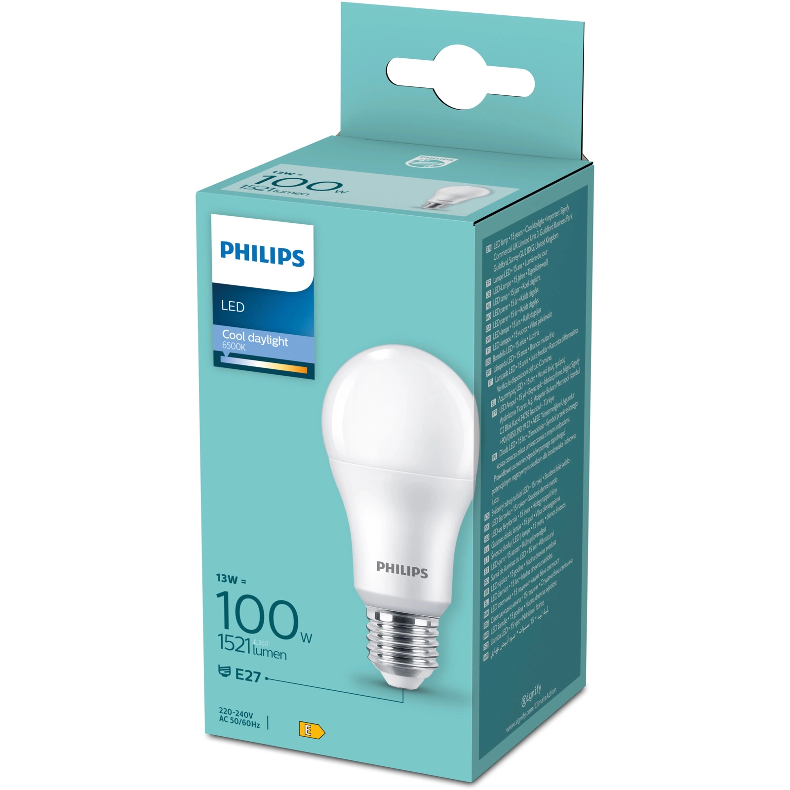 Entdecken Sie eine neue Qualität der Beleuchtung mit der Philips 13W LED-Glühbirne, dem perfekten Ersatz für die klassische 100W Glühbirne. Sparen Sie mit ihrer unglaublichen Effizienz Energie und Kosten. Mit einer Helligkeit von 1521 Lumen liefert sie kristallklares, kaltweißes Licht mit einer Farbtemperatur von 6500 K. Dank ihres Farbwiedergabeindex von Ra 80 erhalten Ihre Innenräume ein völlig neues Aussehen und eine unvergleichliche Farbklarheit. Ob zu Hause, im Büro oder in Geschäftsräumen - die Philips Essential Glühbirne bringt Komfort und Beleuchtungsqualität auf das höchste Niveau!