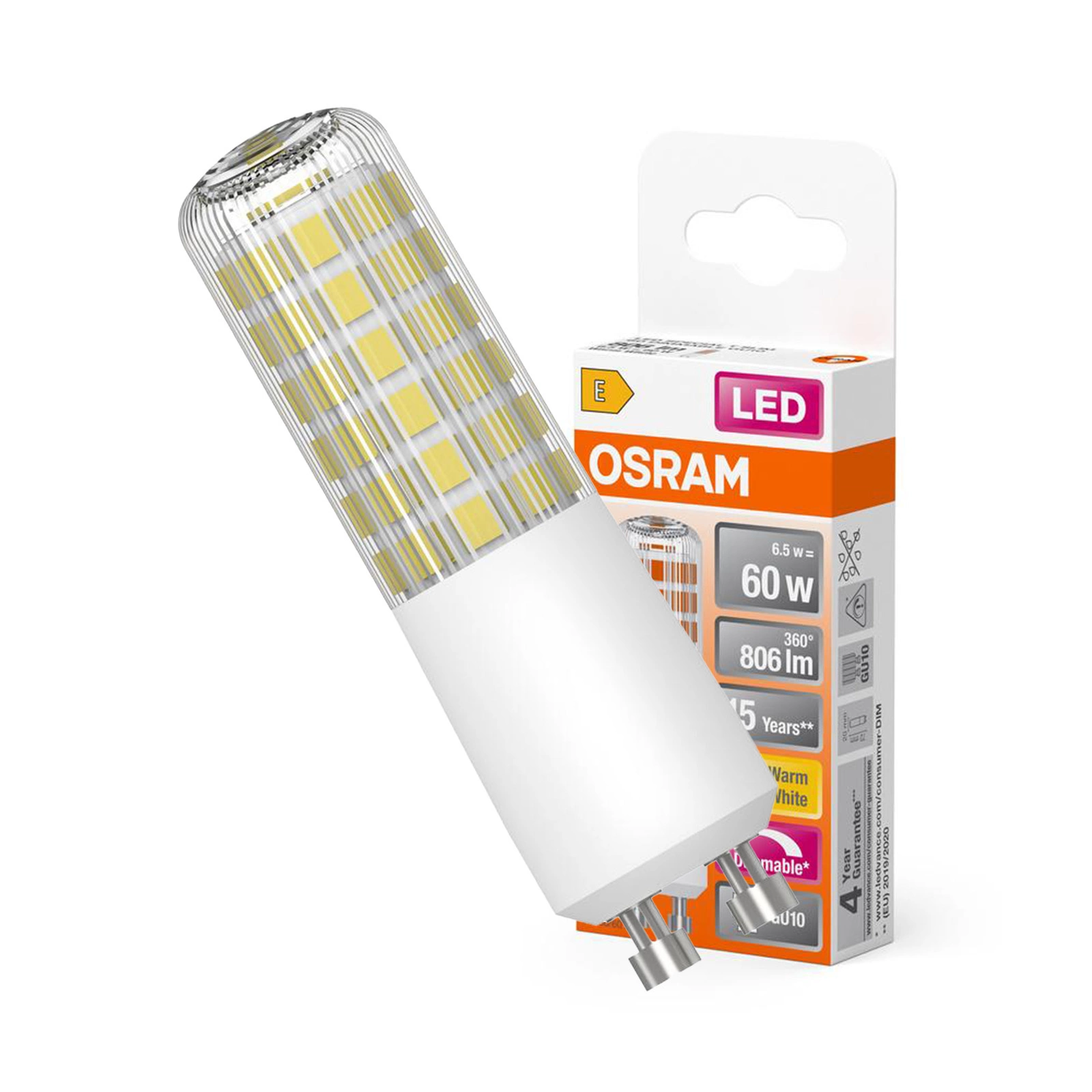 OSRAM LED T Slim 60 320° DIM 6,5W 827 Clear GU10 ist eine moderne LED-Glühbirne mit 6.5 W, die ein hervorragender Ersatz für herkömmliche 50W-Halogenlampen ist. Gibt eine warme Lichtfarbe ab 2700 K und Lichtstrom 350 lm. Es hat einen hohen Farbwiedergabeindex Ra ≥ 80, für eine natürliche Farbwiedergabe. Dank einer lichtausbeute von 115 lm/W i dimmfunktion, ermöglicht die Einstellung der Lichtintensität. Verbraucht bis zu 90 % weniger Energie als herkömmliche Glühbirnen. Ideal für allgemeine und dekorative Beleuchtung, einfach zu installieren dank des Griffs GU10.