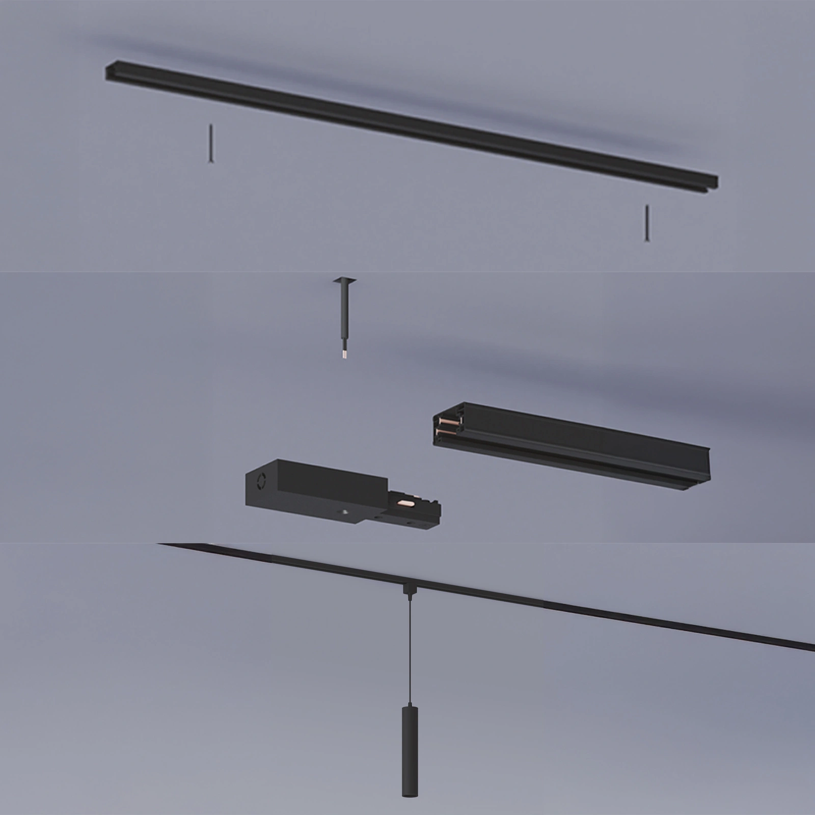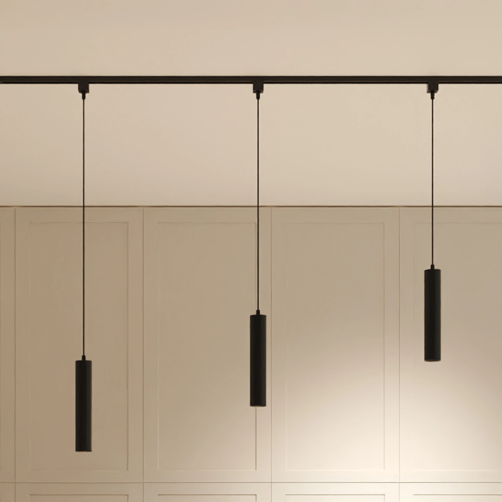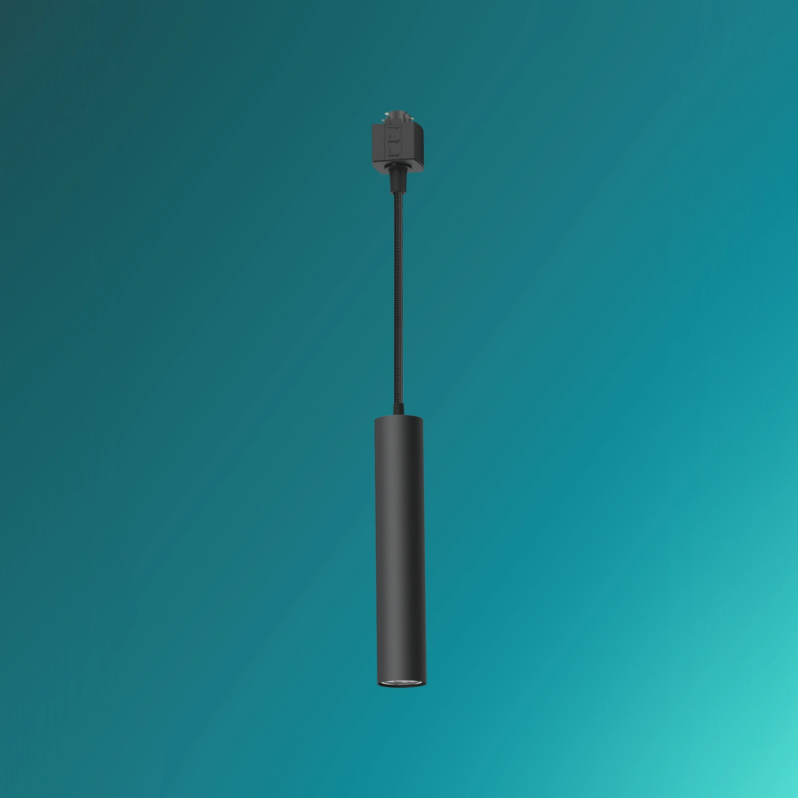 Die robuste Metallkonstruktion und die zylindrische Röhrenform verleihen der Leuchte einen minimalistischen, modernen Look. Durch die Schienenbefestigung lässt sich der Lichtpunkt je nach Raumaufteilung leicht neu positionieren. Die schwarze Farbgebung unterstreicht den eleganten Charakter der Leuchte und fügt sich perfekt in industrielle und moderne Einrichtungen ein.