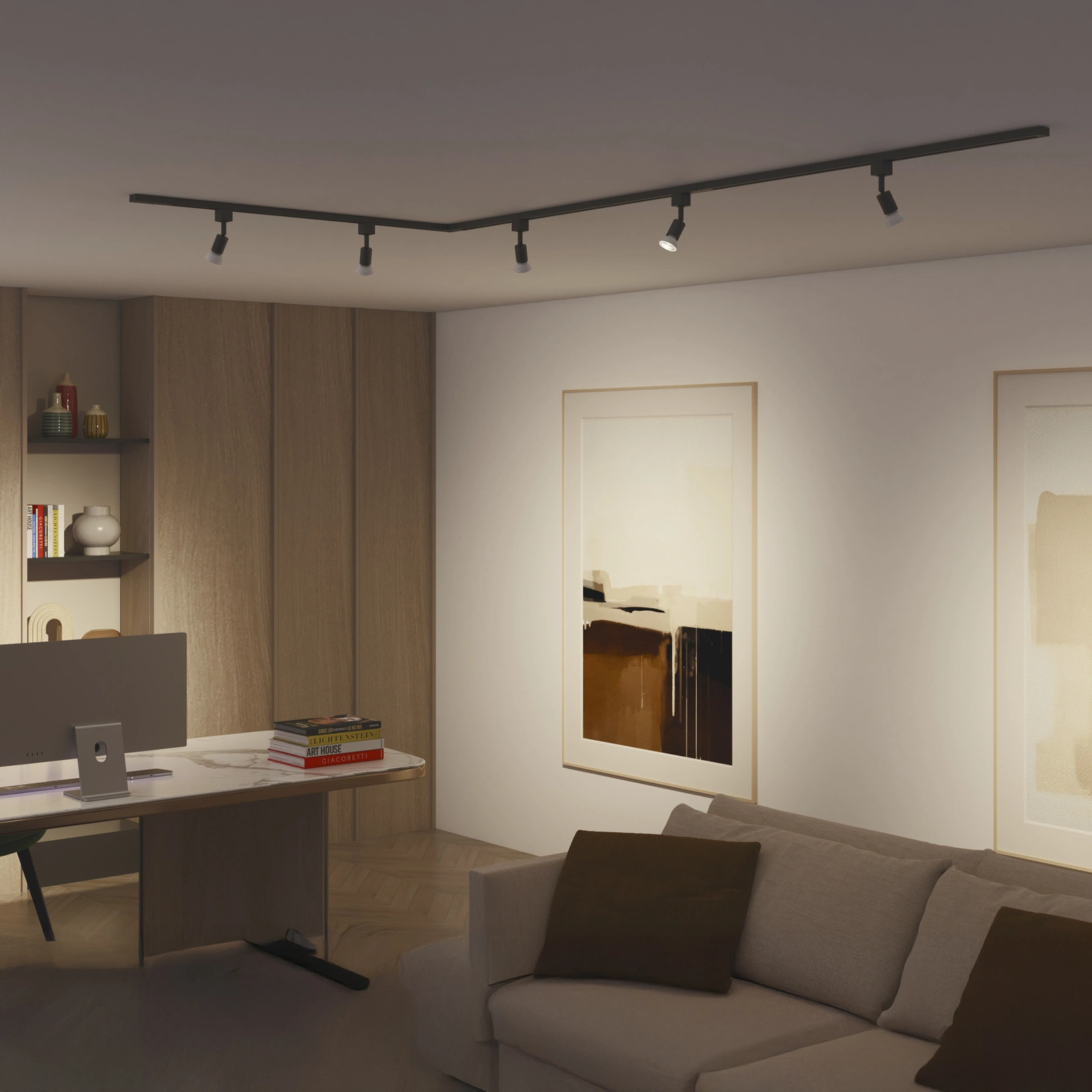 Mit dem Schienensystem haben Sie die volle Kontrolle über Ihre Beleuchtung und können sie genau auf den Lebensstil in Ihrem Zuhause abstimmen. Es funktioniert mit einer breiten Palette von Standard- und intelligenten Glühbirnen und Strahlern mit GU10-Sockel und gibt Ihnen die Freiheit, genau das Licht zu wählen, das Sie brauchen. Die Möglichkeit, dimmbare Lichtquellen mit Fernbedienung zu verwenden, erlaubt es Ihnen, die Atmosphäre Ihres Interieurs ganz einfach zu gestalten, während Lampen mit Farbtemperatursteuerung einen nahtlosen Übergang von kühlem, anregendem Weiß zu warmem, entspannendem Licht ermöglichen. Mit dieser Lösung können Sie den Charakter eines Raumes mit einer einzigen Bewegung verändern und die Beleuchtung an jeden Moment des Tages anpassen.