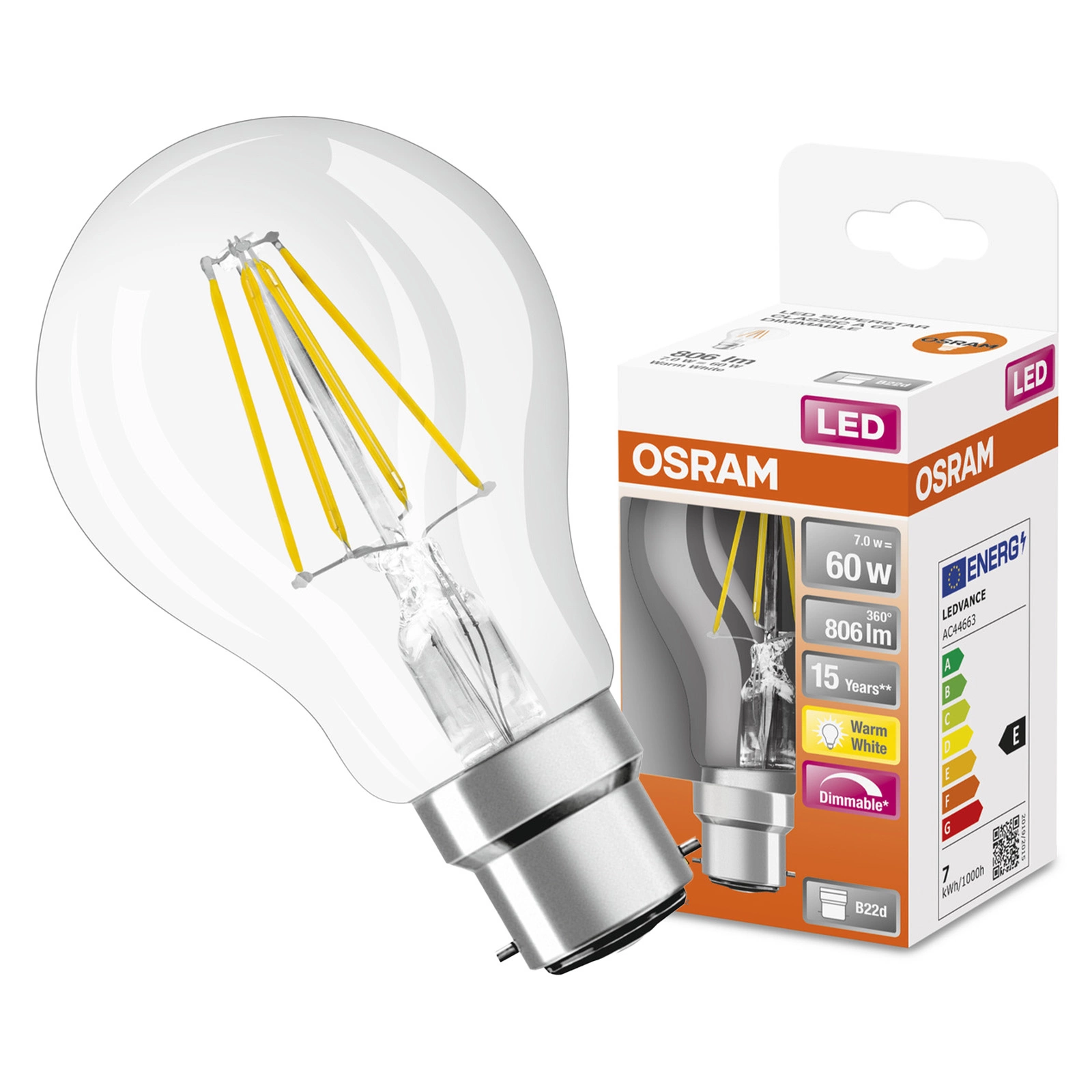 Entdecken Sie moderne Lichttechnik mit der Osram Retrofit Classic LED-Lampe. Diese Glühbirne mit A60-Leuchtmittel mit B22d-Sockel garantiert eine hervorragende Leistung und bietet einen Lichtstrom von 806 lm, was einer herkömmlichen 60W-Glühbirne entspricht, bei einem Energieverbrauch von nur 7W. Mit ihrer hohen Lichtausbeute von 116 lm/W und einer Lebensdauer von bis zu 15.000 Stunden können Sie sich länger an einem warmen Licht von 2700 K erfreuen, das in jedem Raum eine gemütliche Atmosphäre schafft.