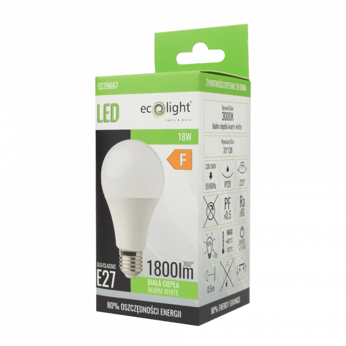 Beleuchten Sie Ihr Zuhause mit einer warmen, einladenden Atmosphäre mit der A70 E27 18W LED-Lampe von Ecolight! Diese hochmoderne Glühbirne bietet einen Lichtstrom von 1620 lm und ermöglicht es Ihnen, jeden Raum effizient und wirtschaftlich zu beleuchten. Mit einer Lichtfarbe von 3000K wird das Innere Ihres Hauses in eine gemütliche Atmosphäre getaucht, die ideal für Entspannung und Erholung ist. Mit einem Sockel des Typs E27 und der Form einer traditionellen Glühbirne ist sie einfach zu installieren und mit den meisten Leuchten kompatibel.