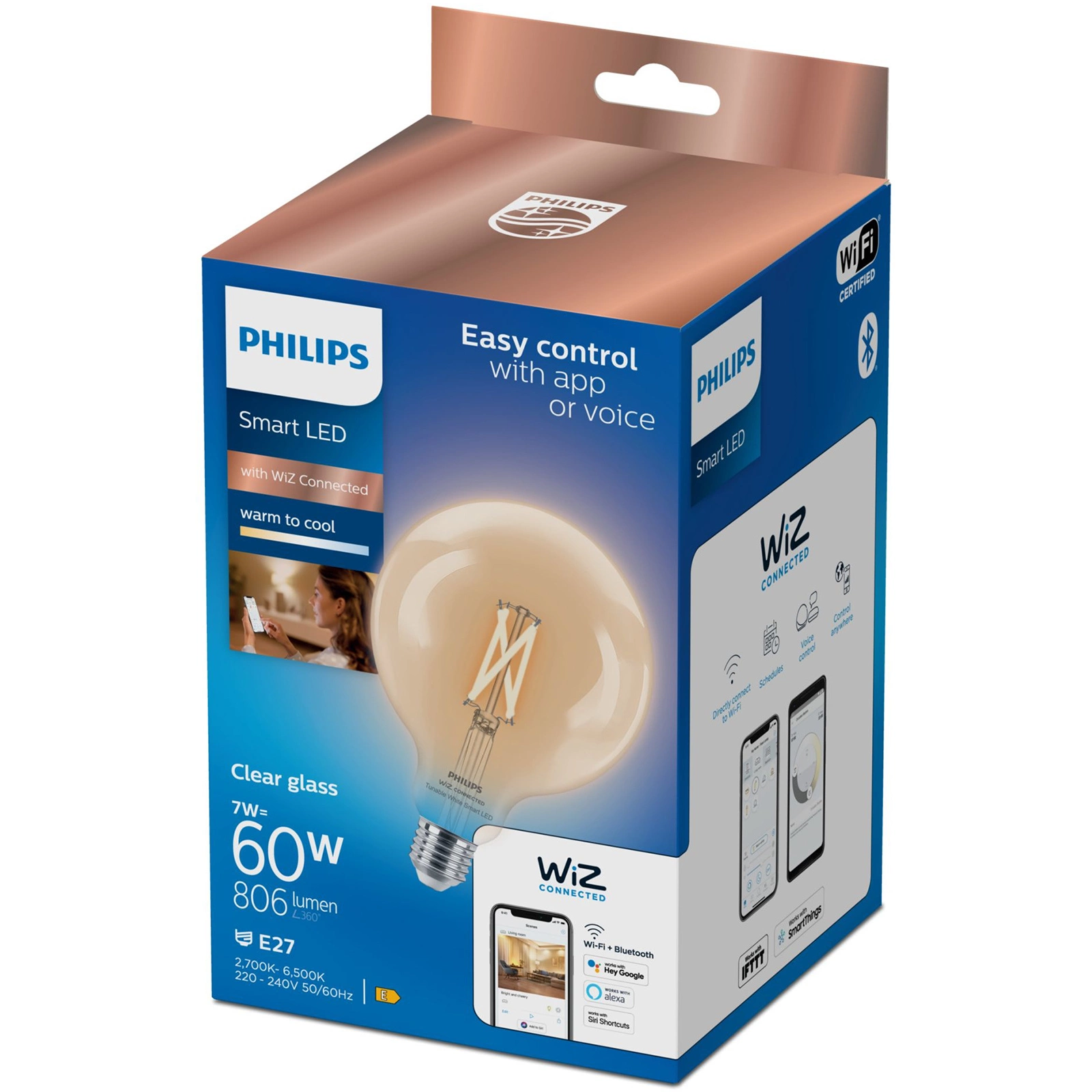 Entdecken Sie moderne Beleuchtung mit der kugelförmigen 7W G125 Smart LED E27 Glühbirne, die eine Helligkeit bietet, die einer traditionellen 60W Glühbirne entspricht. Mit der Möglichkeit, die Farbtemperatur von 2700K bis 6500K einzustellen, können Sie die Atmosphäre in Ihrem Zuhause von kühlem Weiß bis zu einem warmen, gemütlichen Licht einstellen, das perfekt zum Entspannen ist. Dank der integrierten WiFi- und Bluetooth-Technologie können Sie die Beleuchtung ganz einfach über die WiZ Connected-App auf Ihrem Smartphone steuern, was das Energiesparen und die persönliche Gestaltung Ihres Heims einfacher denn je macht.