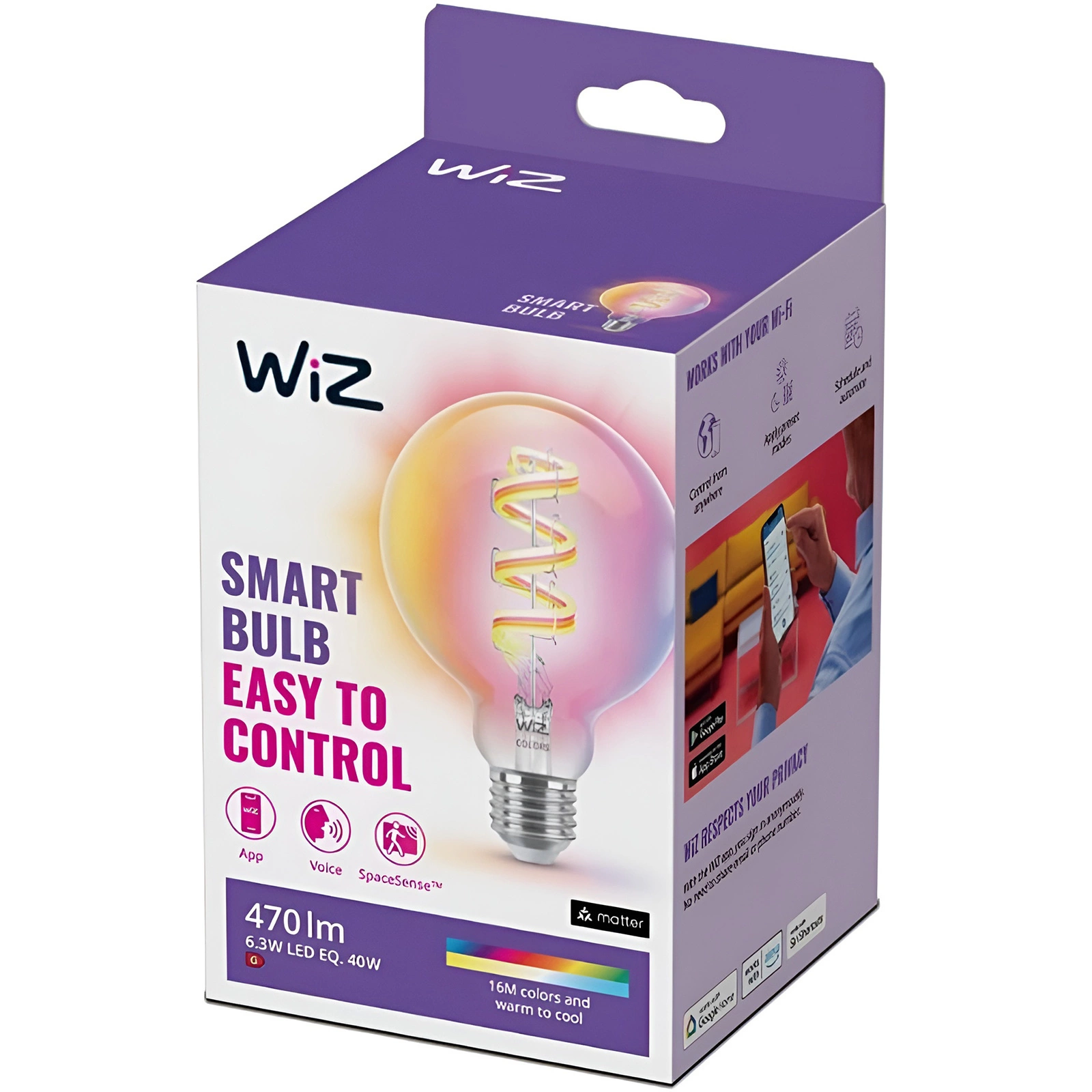 Intelligente LED-Glühbirne von WiZ steuerung über eine mobile App WiZ Verbunden. Die LED-Lampe zeichnet sich durch eine sehr gute Qualität des ausgestrahlten Lichts, eine originalgetreue Farbwiedergabe (CRI80) und eine hohe Lichtausbeute aus. Die Smart LED-Glühbirne ist mit einer energieeffizienten LED-Lichtquelle von 6,3W (entspricht einer herkömmlichen 40W-Glühbirne), einem Lichtstrom von 470lm und dank der mobilen App WiZ Verbunden können wir die Farbtemperatur der Glühbirne einstellen von angenehm warm über neutral bis kalt und mehrfarbig (RGB).