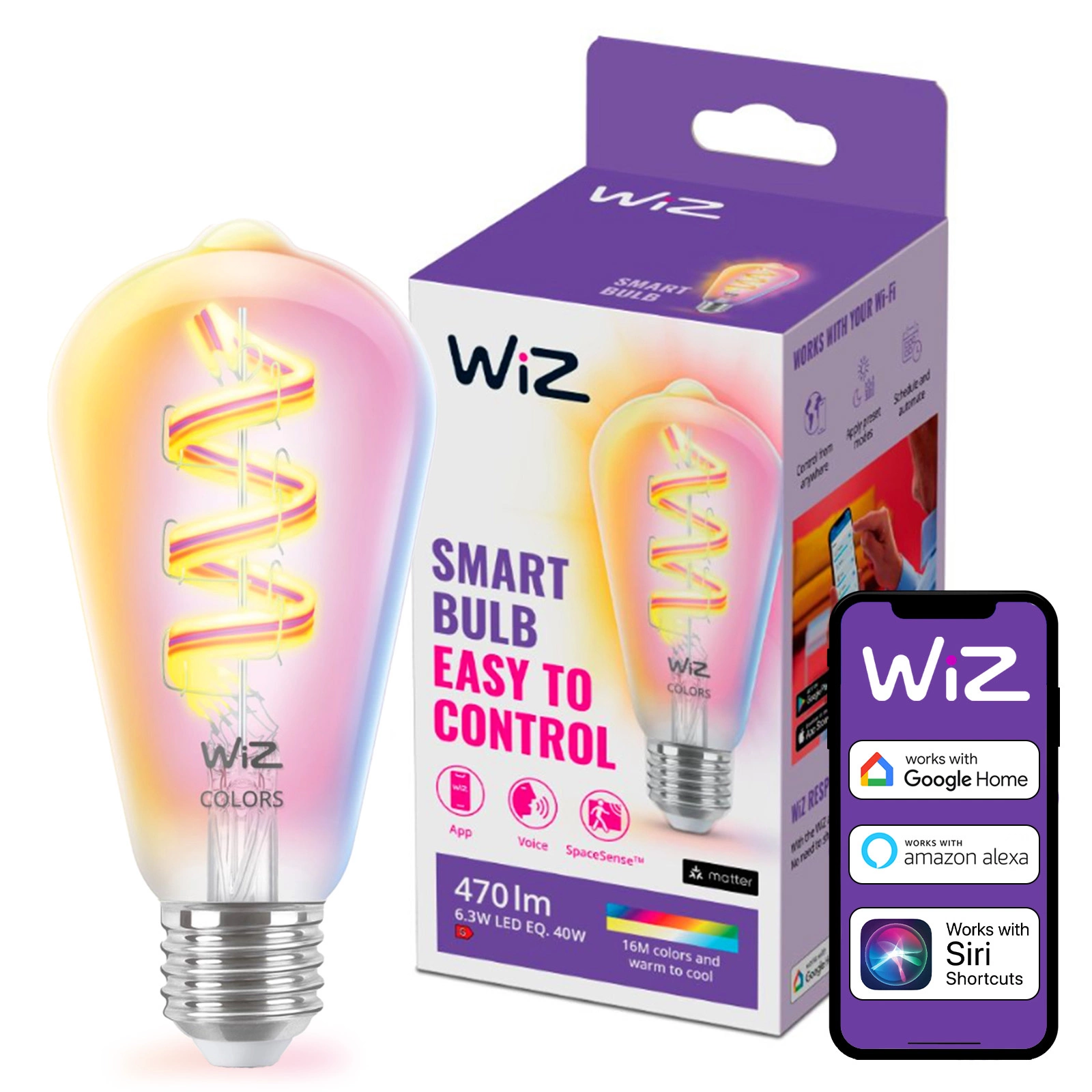 Intelligente LED-Glühbirne von WiZ steuerung über eine mobile App WiZ Verbunden. Die LED-Lampe zeichnet sich durch eine sehr gute Qualität des ausgestrahlten Lichts, eine originalgetreue Farbwiedergabe (CRI80) und eine hohe Lichtausbeute aus. Die Smart LED-Glühbirne ist mit einer energieeffizienten LED-Lichtquelle von 6,3W (entspricht einer herkömmlichen 40W-Glühbirne), einem Lichtstrom von 470lm und dank der mobilen App WiZ Verbunden können wir die Farbtemperatur der Glühbirne einstellen von angenehm warm über neutral bis kalt und mehrfarbig (RGB).