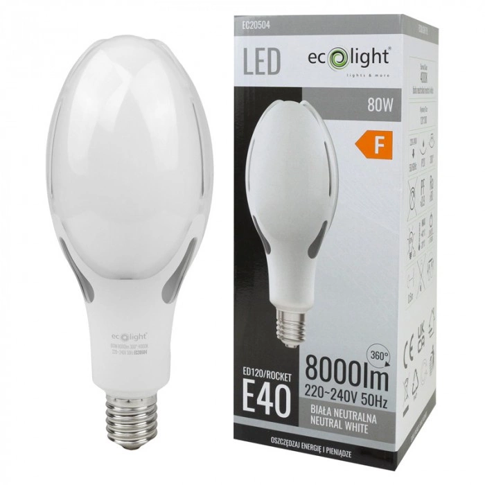 Entdecken Sie die Kraft der modernen Technologie mit der E40 80W 8000lm 4000K Neutral Rocket Ecolight LED-Lampe. Diese Glühbirne wurde im Hinblick auf höchste Effizienz entwickelt und bietet einen beeindruckenden Lichtstrom von 8000 Lumen bei 80W, was eine Lichtausbeute von 100 lm/W bedeutet. Die neutralweiße Lichtfarbe mit einer Farbtemperatur von 4000K schafft ein angenehmes und natürliches Licht, das ideal für jeden Raum ist.