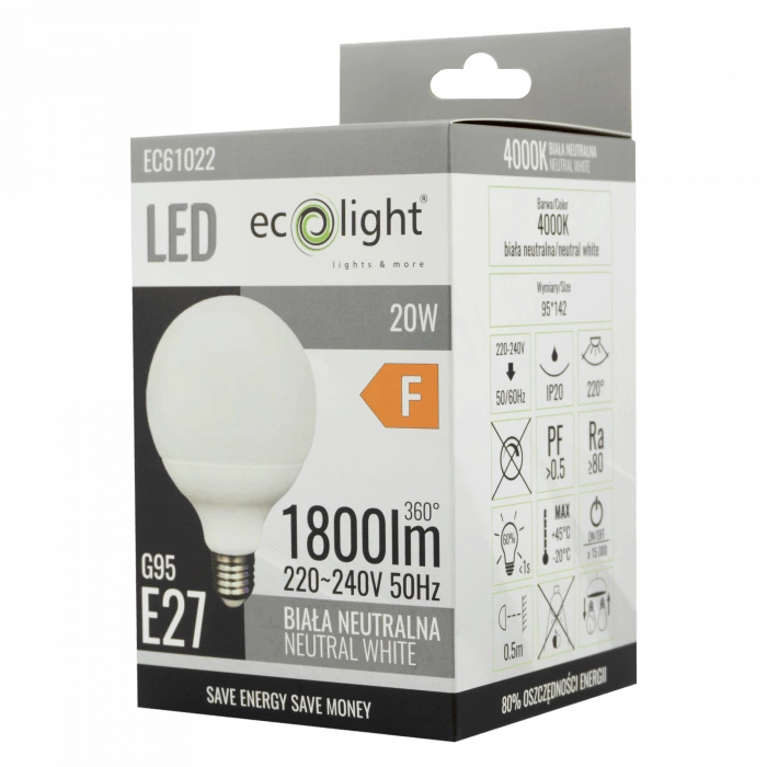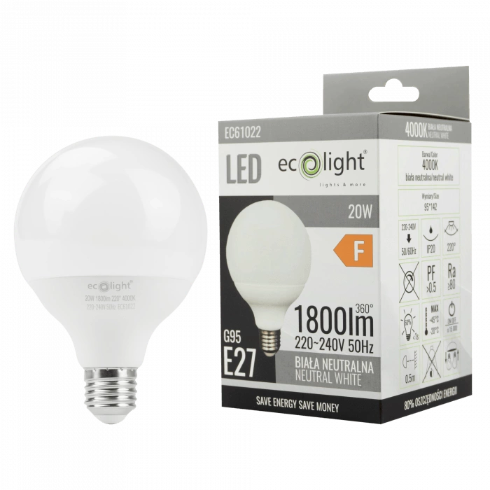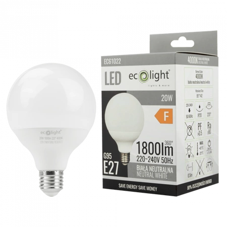 Beleuchten Sie Ihre Innenräume mit der LED-Glühbirne G95 E27 20W 1800lm 4000K von Ecolight. Diese Glühbirne kombiniert modernes Design und hohe Energieeffizienz und ist damit die perfekte Wahl für jeden Raum. Dank ihrer neutralweißen Farbe(4000K) sorgt sie für ein perfektes Arbeitsumfeld und schafft eine angenehme Atmosphäre im ganzen Haus. Dank ihrer Leistung(20 W) erzeugt sie einen intensiven Lichtstrom(1800 lm) und ersetzt damit herkömmliche Lichtquellen bei deutlich geringerem Energieverbrauch.