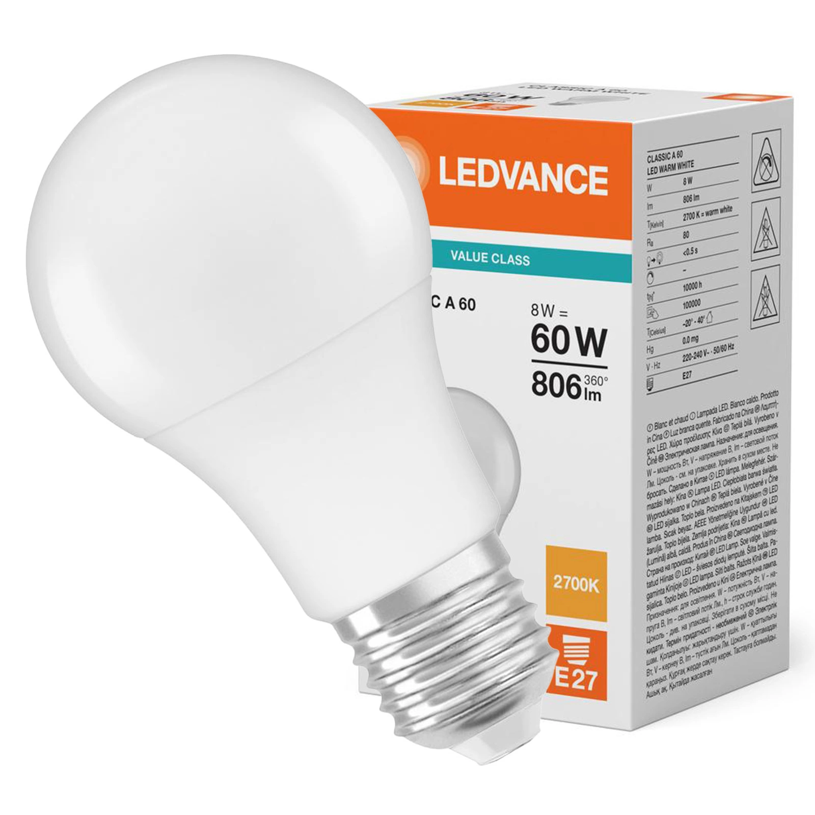 Entdecken Sie exzellente Beleuchtung mit der LED-Glühbirne A60 E27 8W von LEDVANCE. Diese Hightech-Glühlampe bietet die perfekte Kombination aus Energieeffizienz und Leistung und ersetzt herkömmliche 60W-Lichtquellen. Dank der LED-Technologie bietet sie helles Licht mit einem Lichtstrom von 806 Lumen, ideal für die Beleuchtung von Wohnräumen, Büros oder anderen Arbeitsbereichen. Die warmweiße Lichtfarbe von 3000K macht es zu einem Produkt, das eine gemütliche Atmosphäre schafft.