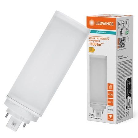 Entdecken Sie die Exzellenz der Beleuchtung mit der LED-Glühbirne DULUX GX24q-3 von LEDVANCE, die auf überraschende Weise Energieeffizienz mit Leistung verbindet. Dieser hochmoderne Ersatz für herkömmliche 26-W-Glühbirnen verbraucht nur 10 W, was zu erheblichen Energieeinsparungen führt, während die volle Lichtleistung von 1100 Lumen erhalten bleibt. Die neutralweiße Lichtfarbe von 4000K schafft eine angenehme und komfortable Atmosphäre, ideal für den täglichen Gebrauch in Büros, Wohnungen und öffentlichen Räumen. Die Kappe GX24q-3 und die röhrenförmige Form garantieren eine breite Palette von Anwendungen, während die matte Farbe der Blende ein weiches und diffuses Licht erzeugt.