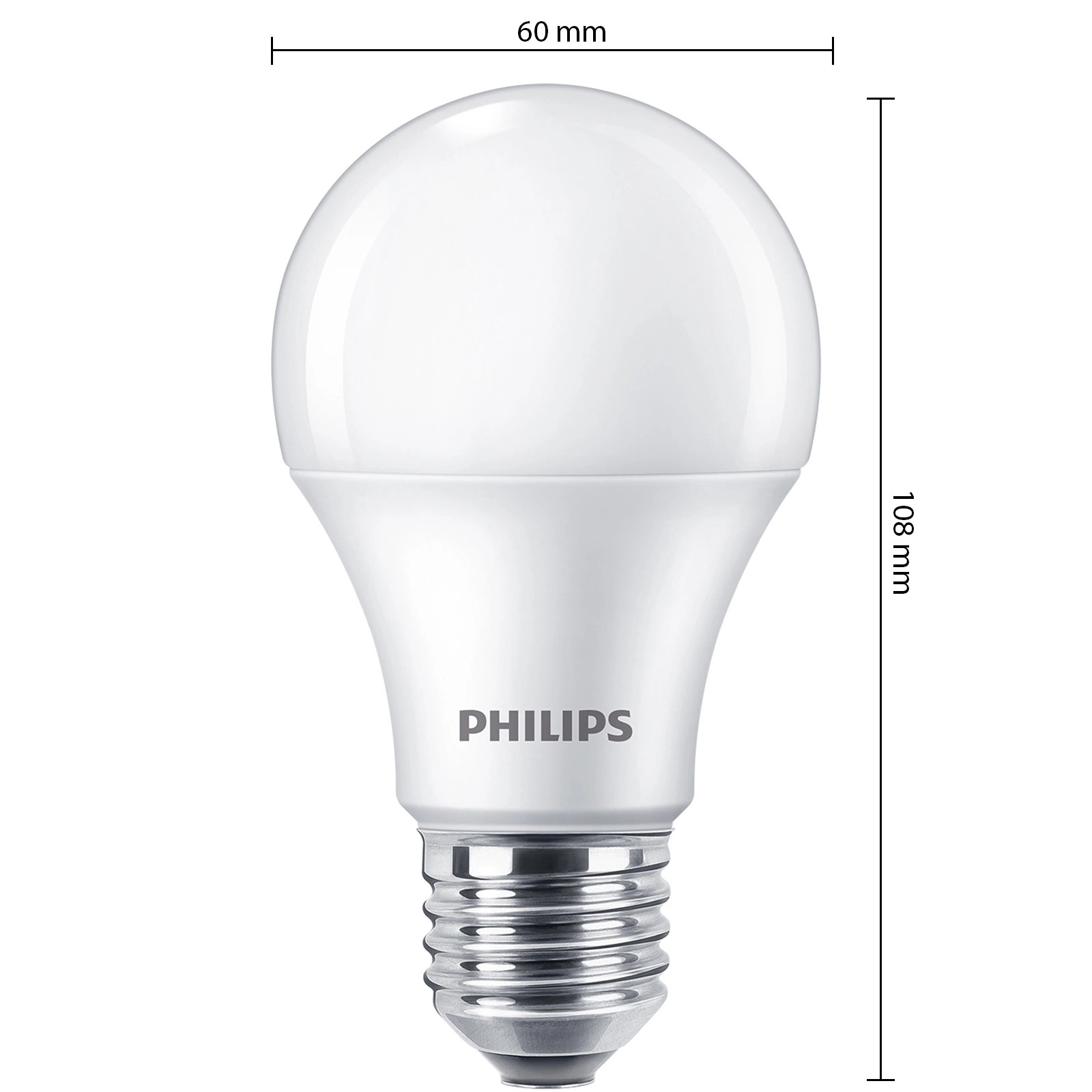 Wir stellen die äußerst sparsame und funktionelle Philips Essential LED E27-Glühbirne vor, die moderne Technologie mit Alltagskomfort verbindet. Mit einer Lichtleistung von 1055 lm ist diese Glühbirne ein hervorragender Ersatz für eine herkömmliche 75-W-Glühbirne und verbraucht nur 10 W Energie. Mit einer Farbtemperatur von 6500 K bietet sie ein helles, kaltes Licht, das Ihr Büro, Ihre Küche oder Ihren Arbeitsbereich perfekt ausleuchtet. Die Glühbirne ist in der klassischen A60-Form gestaltet und hat einen Standard-E27-Sockel, so dass sie in die meisten Lampen und Armaturen passt.