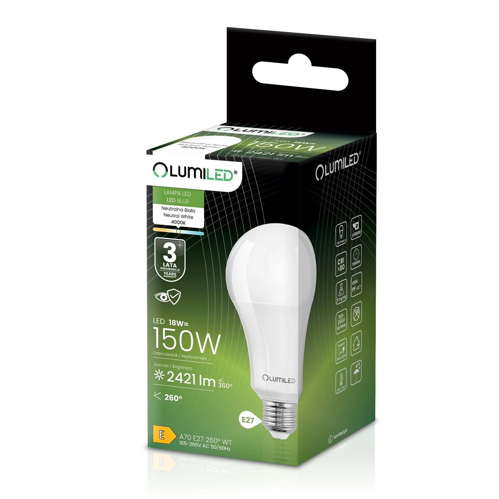 Die LED-Glühbirne der renommierten Marke LUMILED mit E27-Sockel und 18 W ist ein hervorragender Ersatz für herkömmliche 150 W-Glühbirnen und bietet Energieeinsparungen und eine längere Lebensdauer. Sie emittiert Licht mit einem Lichtstrom von 2421 Lumen und einer neutralen Farbe von 4000K, was sie ideal für die Innenbeleuchtung macht, wo eine helle und natürliche Lichtfarbe erforderlich ist. Der Abstrahlwinkel von 260° ermöglicht eine breite Streuung des Lichts, wodurch der Raum effektiv beleuchtet wird. Dank ihrer hochwertigen Konstruktion hat sie eine Lebensdauer von bis zu 15.000 Stunden, was einer langjährigen Nutzung entspricht. Darüber hinaus kann sie in einem breiten Spannungsbereich von 165-265 V betrieben werden und ist für Umgebungstemperaturen von -20°C bis +40°C geeignet. Eine ideale Wahl für alle, die Wert auf Energieeinsparung und Umweltschutz legen.