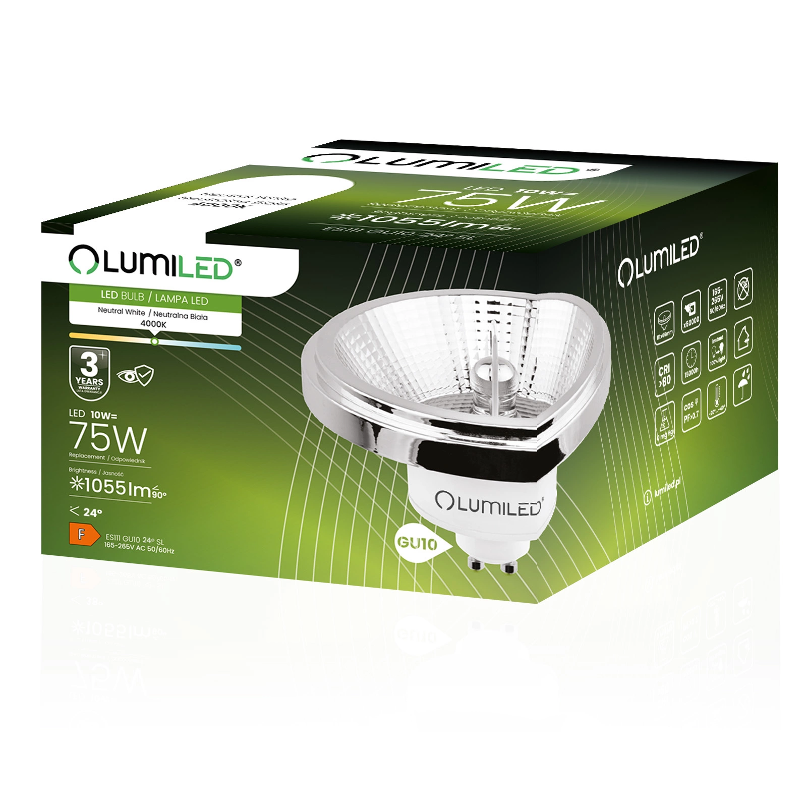 Die LED-Glühbirne der renommierten Marke LUMILED mit GU10-Sockel und 10W ist ein hervorragender Ersatz für herkömmliche 75W-Glühbirnen und bietet Energieeinsparungen und eine längere Lebensdauer. Sie emittiert Licht mit einem Lichtstrom von 1055 Lumen und einer neutralen Farbe von 4000K, was sie ideal für die Innenbeleuchtung macht, wo eine helle und natürliche Lichtfarbe erforderlich ist. Der Abstrahlwinkel von 24° ermöglicht eine enge Lichtverteilung, wodurch die zu beleuchtenden Objekte wirkungsvoll akzentuiert werden. Dank ihrer hochwertigen Verarbeitung hat sie eine Lebensdauer von bis zu 15.000 Stunden, was einer langjährigen Nutzung entspricht. Darüber hinaus arbeitet sie in einem weiten Spannungsbereich von 165-265 V und ist für den Einsatz bei Umgebungstemperaturen von -20°C bis +40°C geeignet. Eine ideale Wahl für alle, die Wert auf Energieeinsparung und Umweltschutz legen.