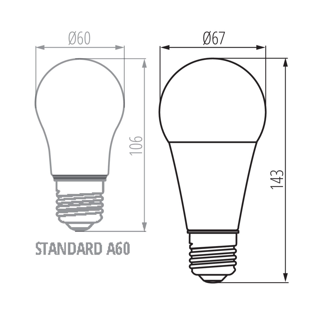 Glühbirne Kanlux IQ-LED E27 A67 mit einer Leistung von 19W und Lichtstrom 2452 lm, die kaltes Licht mit einer Temperatur von 6500K, ist die ideale Lichtquelle für Arbeitsbereiche, die eine intensive, kühle Beleuchtung erfordern. Garantiert hohe Energieeffizienz und lange Lebensdauer.