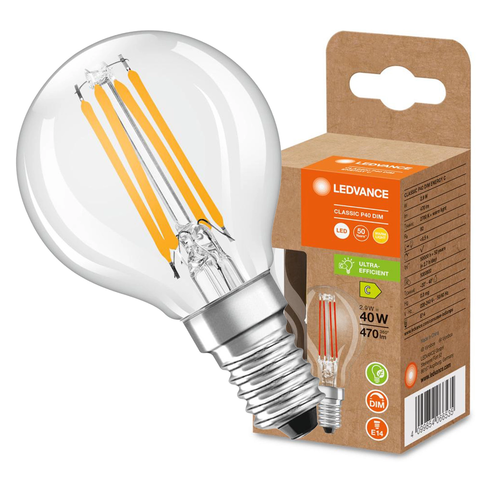 Wir bieten die LED-Glühbirne der Marke LEDVANCE an, die ein hervorragender Ersatz für die traditionelle 40-W-Glühbirne ist und dank ihrer Leistungsabgabe von nur 2,9 W erhebliche Energieeinsparungen bietet. Diese Glühbirne garantiert einen Lichtstrom von 470 Lumen bei einer Farbtemperatur von 2700K und bietet ein angenehmes, warmweißes Licht, das in jedem Raum eine gemütliche Atmosphäre schafft. Dank der hochwertigen Materialien und der transparenten Lampenschirme ist sie nicht nur funktional, sondern auch ästhetisch ansprechend. Die Glühlampe hat einen hohen Farbwiedergabeindex von Ra 80, was bedeutet, dass die Farben im Raum perfekt wiedergegeben werden.