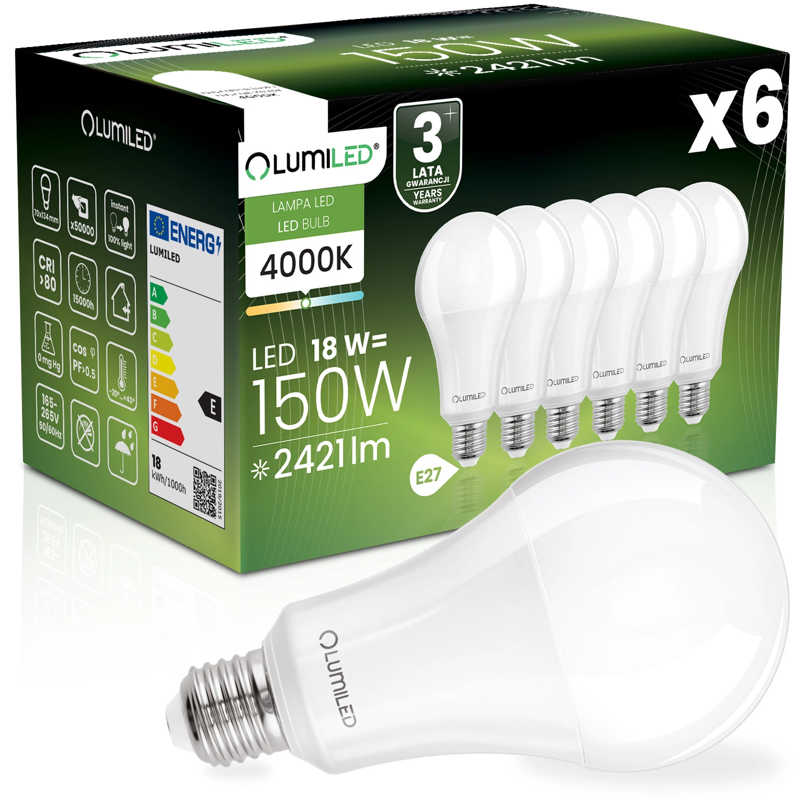 Dieser Satz von 6x LED-Glühbirnen der renommierten Marke LUMILED mit E27-Sockel und 18W ist ein hervorragender Ersatz für herkömmliche 150W-Glühbirnen und bietet Energieeinsparungen und eine längere Lebensdauer. Sie emittiert Licht mit einem Lichtstrom von 2421 Lumen und einer neutralen Farbe von 4000K, was sie ideal für die Innenbeleuchtung macht, wo eine helle und natürliche Lichtfarbe erforderlich ist. Der Abstrahlwinkel von 260° ermöglicht eine breite Streuung des Lichts, wodurch der Raum effektiv beleuchtet wird. Dank ihrer hochwertigen Konstruktion hat sie eine Lebensdauer von bis zu 15.000 Stunden, was einer langjährigen Nutzung entspricht. Darüber hinaus kann sie in einem breiten Spannungsbereich von 165-265 V betrieben werden und ist für Umgebungstemperaturen von -20°C bis +40°C geeignet. Eine ideale Wahl für alle, die Wert auf Energieeinsparung und Umweltschutz legen.