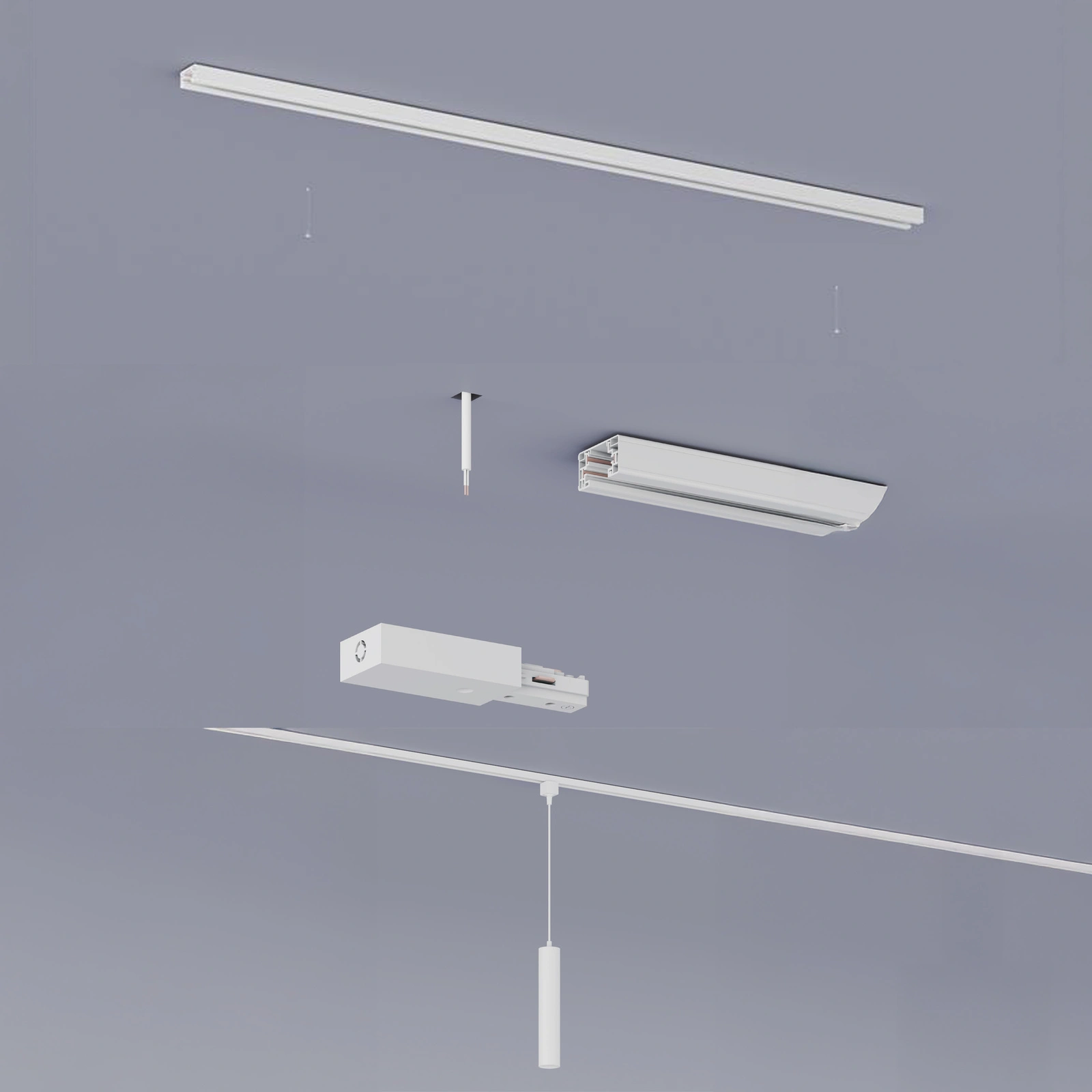 Die Schiene dient als zentrale Basis für das gesamte System und gewährleistet so die Konsistenz und die Möglichkeit, die Installation weiter auszubauen. Ein Stromanschluss und eine Endkappe sind im Lieferumfang enthalten und ermöglichen eine schnelle und ästhetisch ansprechende Fertigstellung der Installation. Die weiße Farbgebung verleiht dem Ganzen Leichtigkeit und fügt sich perfekt in moderne, minimalistische Inneneinrichtungen ein.