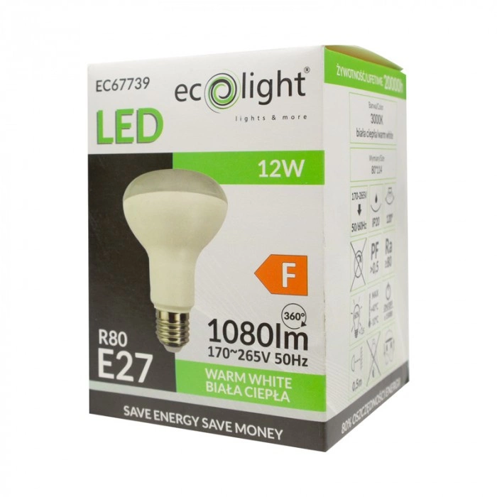 Entdecken Sie die Einzigartigkeit der LED Reflector R80 Glühbirne von ECO LIGHT! Mit 12W und einem Lichtstrom von 1080 lm ist diese sparsame Glühbirne die ideale Lösung für alle, die warmes, gemütliches Licht in 3000K schätzen. Dank der sorgfältig entworfenen Form des R80-Reflektors und des praktischen E27-Sockels passt sie perfekt in jedes Interieur und verleiht ihm einen einzigartigen Charakter und Funktionalität. Sie ist ideal für den Hausgebrauch und wird mit 220-240 V betrieben. Sie bietet eine optimale Beleuchtung mit einem breiten Lichtverteilungswinkel von 120°.