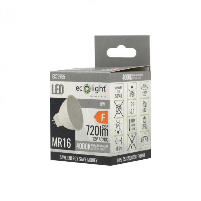 Diese wirtschaftliche Glühbirne passt auf einen GU5.3-Sockel und wird mit 12 V Gleichstrom betrieben, was sie zu einer flexiblen Lösung für verschiedene Beleuchtungsinstallationen macht. Mit einem breiten Lichtabstrahlungswinkel von 120° wird der Innenraum gleichmäßig beleuchtet und die Lichtausbeute von 80 lm/W senkt die Energiekosten. Entscheiden Sie sich für die Qualität und Zuverlässigkeit der Marke ECO LIGHT, um Ihr Leben zu erhellen!