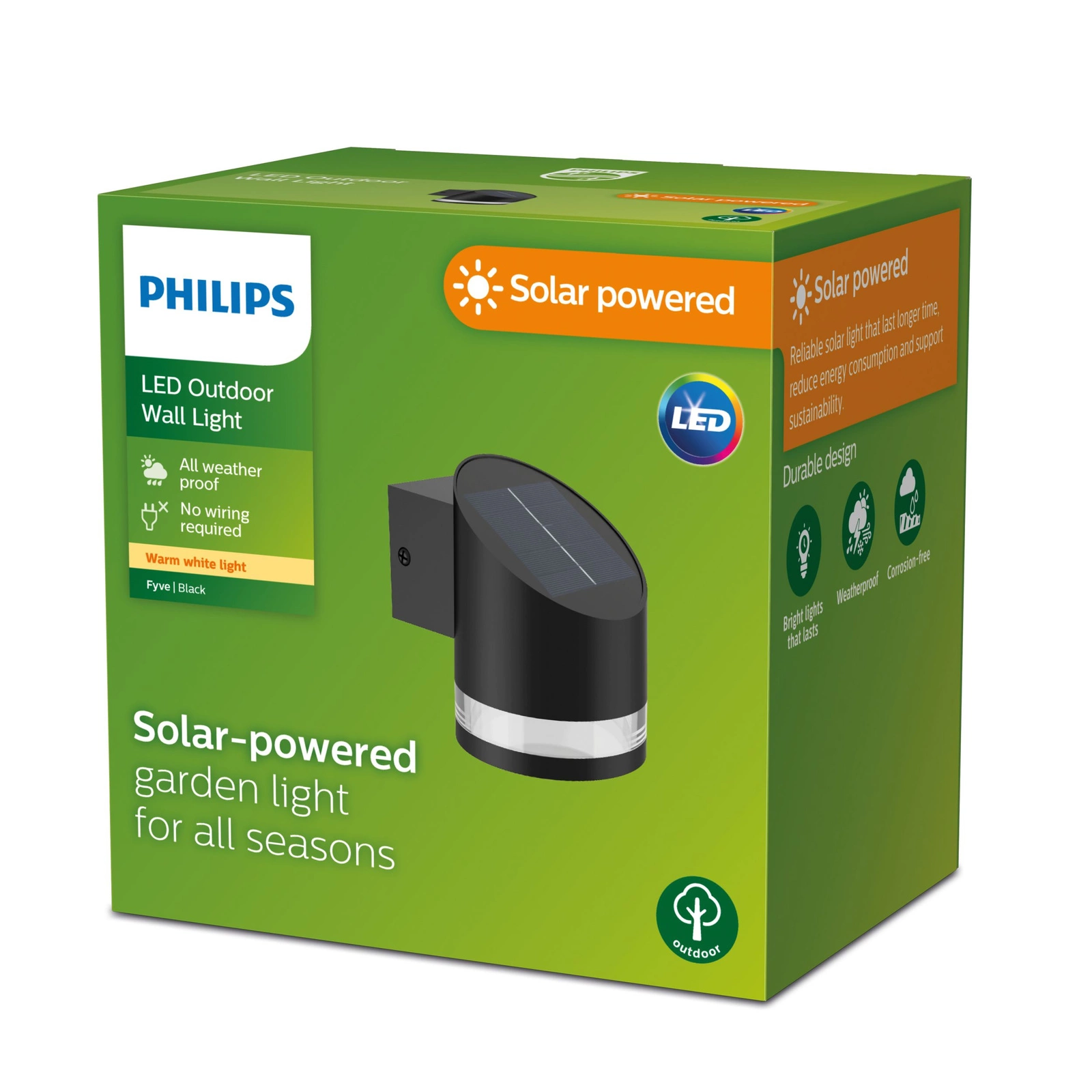Die Philips Fyve Gartenwandlampe ist eine einzigartige Solarlampe, die zur Beleuchtung einer Außenfassade entwickelt wurde und Funktionalität mit modernem Design verbindet. Ausgestattet mit einer energieeffizienten 1,5-W-LED liefert sie eine Helligkeit von 200 Lumen bei einer Farbtemperatur von 2700K und schafft dank der warmweißen Lichtfarbe eine gemütliche Atmosphäre. Ihr robustes schwarzes Gehäuse fügt sich perfekt in verschiedene architektonische Stile ein, und dank der Solarstromversorgung und der Schutzart IP44 eignet sie sich hervorragend für den Einsatz im Freien und ist resistent gegen wechselnde Witterungsbedingungen. Darüber hinaus verfügt die Wandleuchte über eine lange Lebensdauer von bis zu 15.000 Stunden, die eine zuverlässige Leistung über viele Jahreszeiten hinweg gewährleistet. Eine ideale Lösung für alle, die Wert auf Energieeinsparung, Ästhetik und Zuverlässigkeit legen.