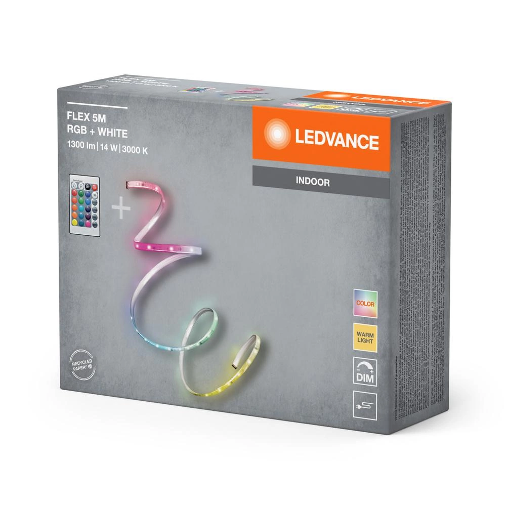 Beleuchten Sie Ihr Interieur auf moderne Art und Weise mit dem Ledvance 14W 3000K Warm RGBw Pilot 5M Flex LED Strip. Durch die Kombination einer warmweißen Farbe mit einer mehrfarbigen RGB-Palette können Sie die Atmosphäre Ihres Raumes an jeden Anlass anpassen. Das Produkt bietet eine Nennleistung von 14 W und einen Lichtstrom von 1300 lm, was eine außergewöhnliche Lichtausbeute von 92 lm/W ergibt.