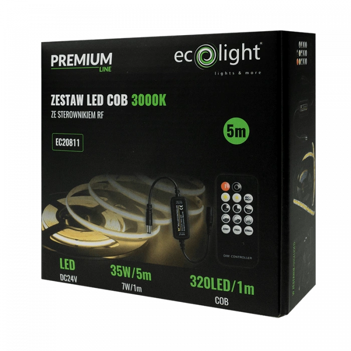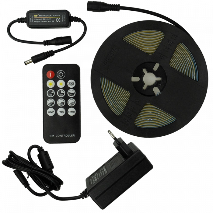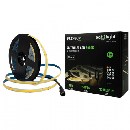 LED-Streifen COB 7W/m 630lm/m 320LED/m 24V 3000K Warm IP20 Rolle 5m + Netzteil + Fernbedienung Ecolight