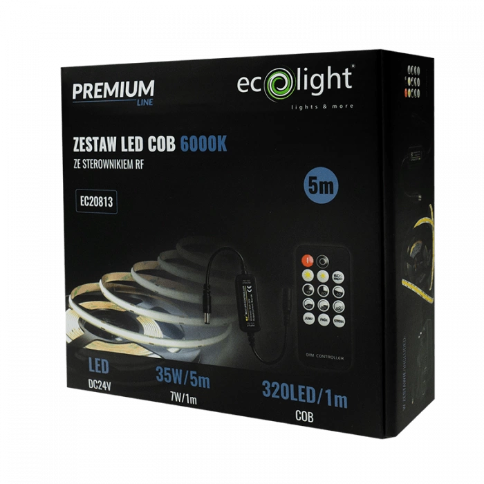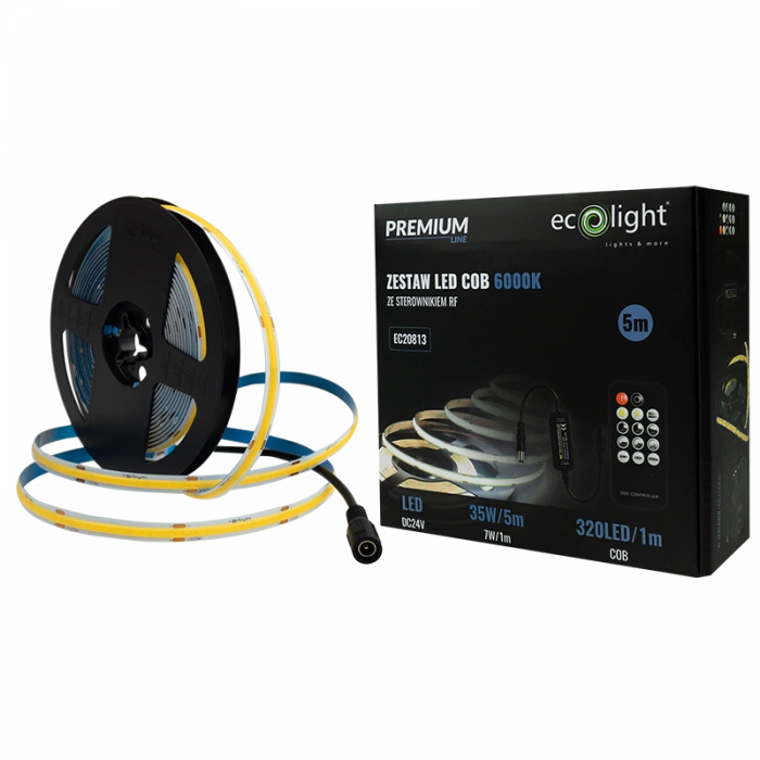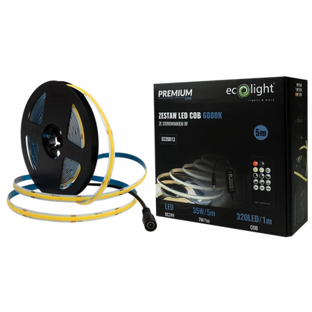 LED-Streifen COB 7W/m 630lm/m 320LED/m 24V 6000K Cold IP20 Rolle 5m + Netzteil + Fernbedienung Ecolight