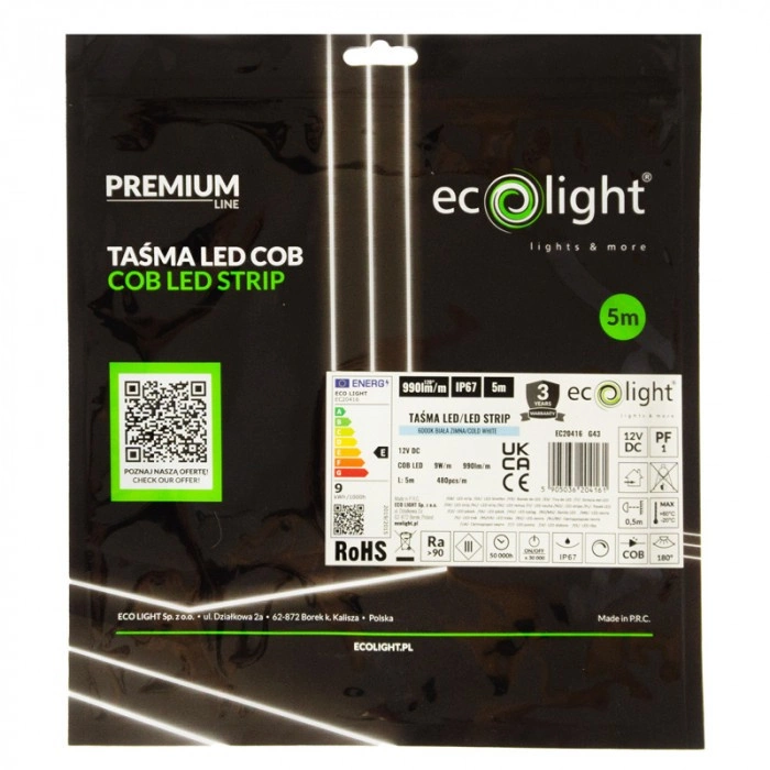 Dank der Schutzart IP67 ist er feuchtigkeits- und staubbeständig und eignet sich daher ideal für Installationen im Freien. Der Beleuchtungswinkel von 180° und die Dimmbarkeit über den Controller ermöglichen die volle Kontrolle über die Lichteffekte. Die integrierten COB-LEDs und die beeindruckende Anzahl von 480 LEDs pro Meter sorgen für eine gleichmäßige, intensive Beleuchtung, die jeden Raum aufwertet. Treffen Sie die weise Entscheidung für eine umweltfreundliche und nachhaltige Beleuchtung mit dem LED-Band von ECO LIGHT.