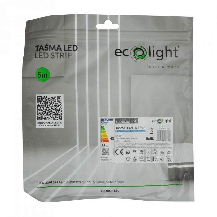 Entdecken Sie eine neue Ebene der Beleuchtung mit Ecolight LED Tape! Unser sorgfältig entworfener LED-Streifen SMD 2835 10.8W/m 500lm/m 60LED/m 24V 6500K Cold IP20 Rolle 5m ist die perfekte Wahl für Ihre Inneneinrichtung. Mit 10,8 W pro Meter und einem Lichtstrom von 500 lm/m bietet es genug Licht, um jeden Raum zu erhellen und gleichzeitig Energie zu sparen. Das kühle weiße 6500K-Licht verleiht Ihrer Einrichtung einen modernen Touch und passt perfekt in Ihr Wohnzimmer, Schlafzimmer oder Ihren Flur. Die fortschrittlichen SMD 2835-LEDs sorgen für Langlebigkeit und gleichmäßige Ausleuchtung, während die dimmbare Option es Ihnen ermöglicht, die Lichtintensität an Ihre Stimmung anzupassen und so das perfekte Ambiente zu schaffen.