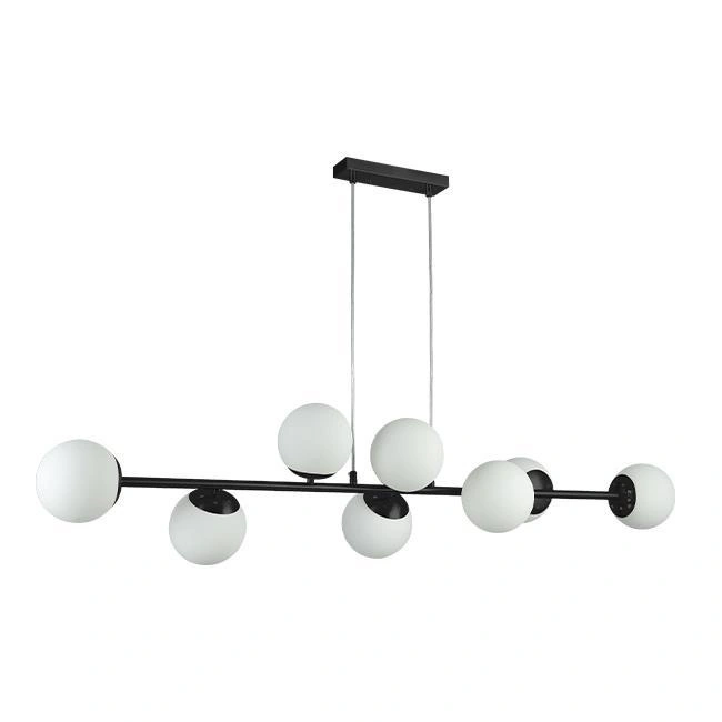 Die Leuchte bietet bis zu acht Lichtpunkte und ist damit ideal für größere Räume geeignet. Sie sorgt für eine gleichmäßige, eindrucksvolle und angenehme Beleuchtung im gesamten Raum. Die Kombination der schwarzen Farbe mit den milchigen Schirmen verleiht der Leuchte einen modernen, prestigeträchtigen Charakter, der den Einrichtungsstil unterstreicht und eine elegante Atmosphäre schafft.