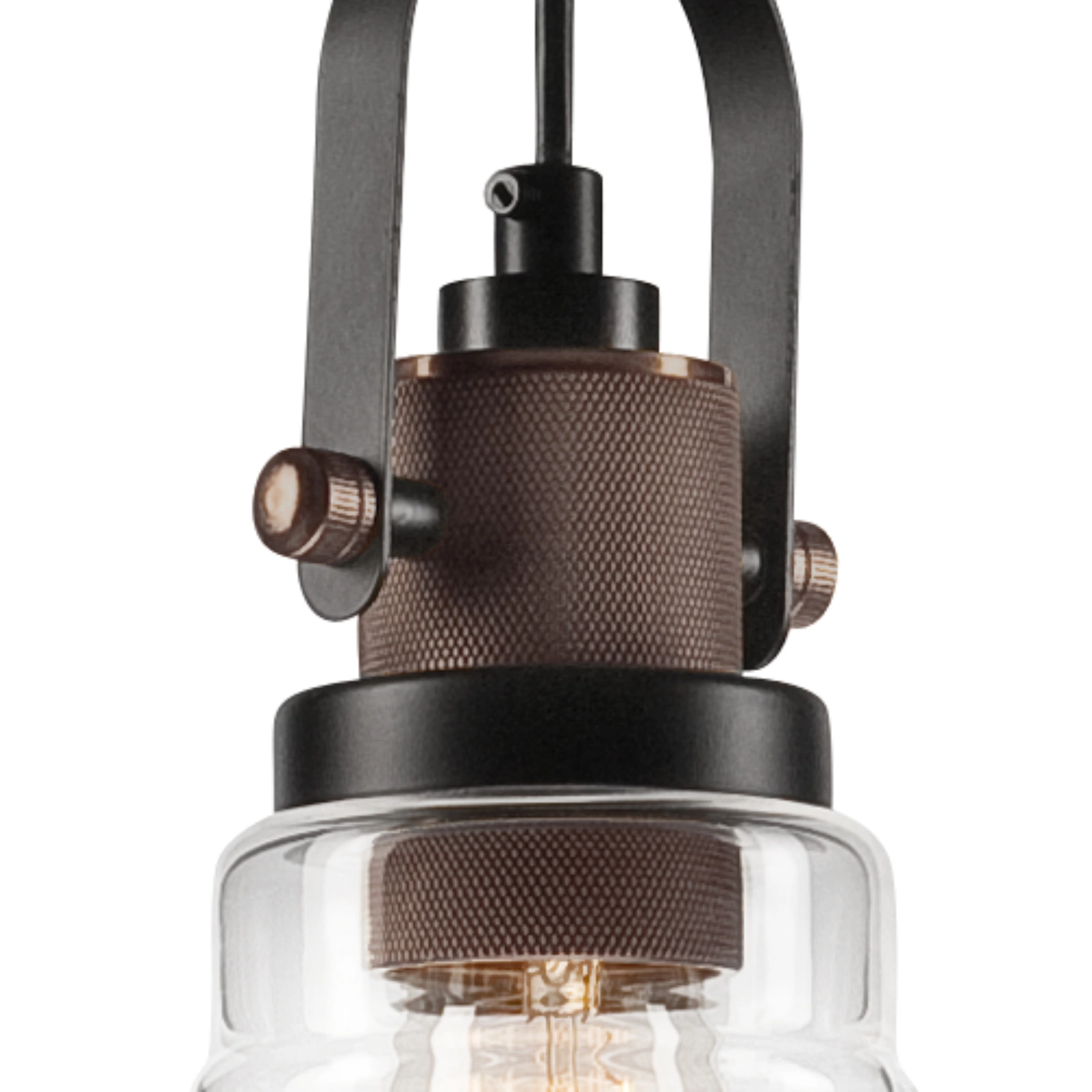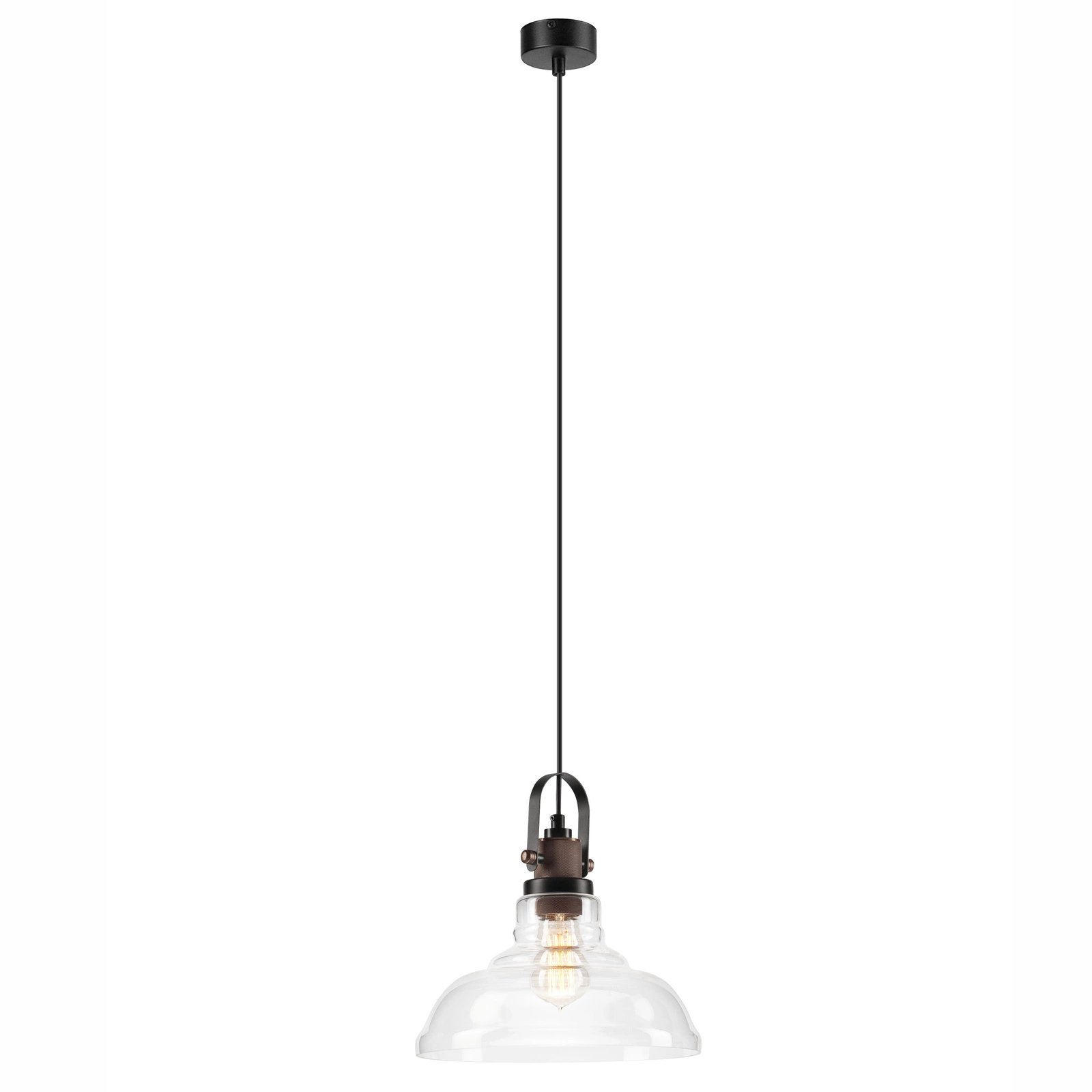 Die Hängeleuchte ist aus Metall gefertigt, pulverbeschichtet und in schwarzer Struktur (matt) mit einem dekorativen Element aus Kupfer ausgeführt. Es ist möglich, das Kabel zu kürzen.