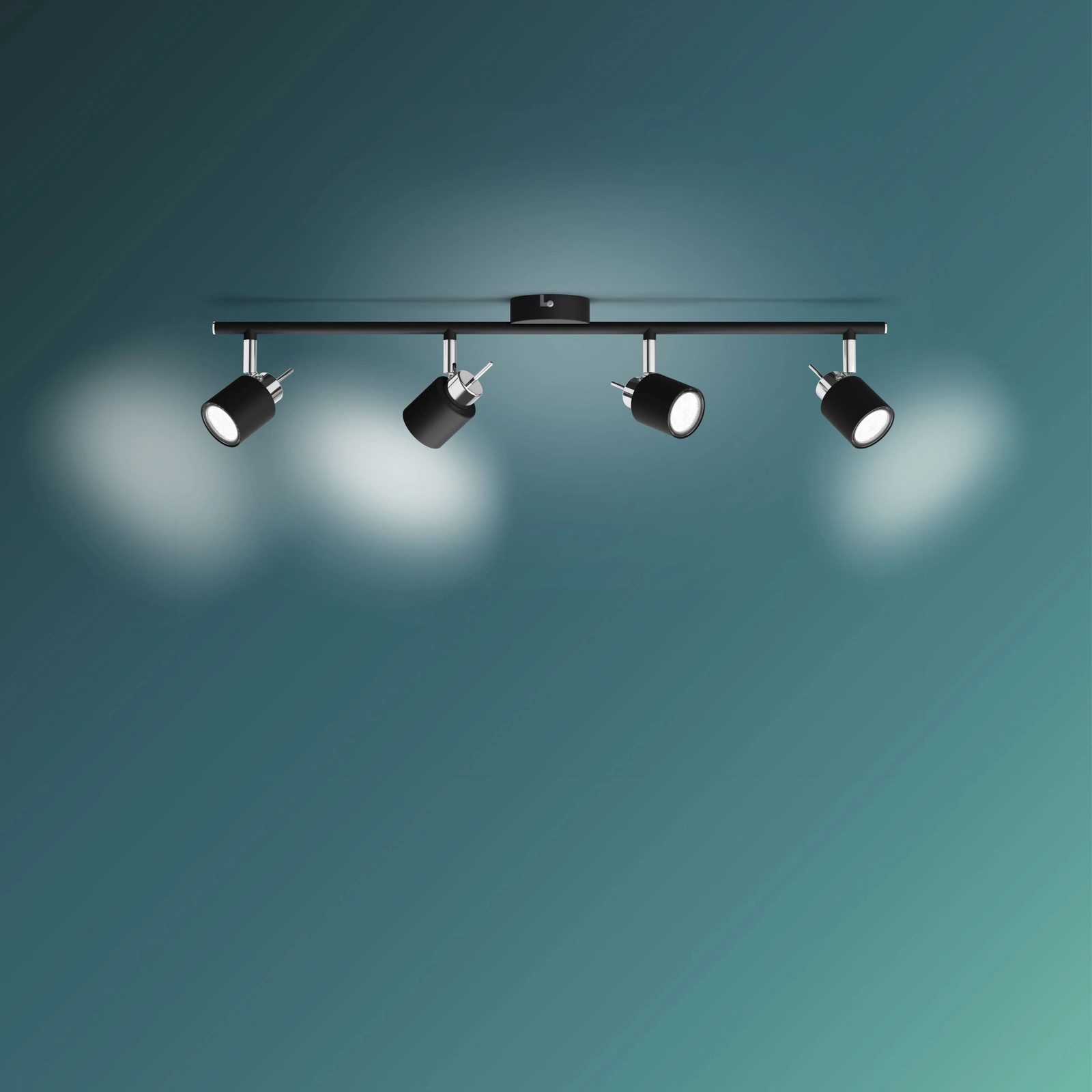 Die 4x GU10 Reflektor-Deckenleuchte in Schwarz von Meranti Philips ist die perfekte Kombination aus modernem Design und Funktionalität. Ausgestattet mit vier GU10-Fassungen ermöglicht sie eine konzentrierte Ausleuchtung des Raums, was in Räumen wie Küche, Wohnzimmer oder Büro äußerst nützlich ist. Dank ihrer universellen Versorgungsspannung von 220-240 V und einer Frequenz von 50-60 Hz ist diese Lampe mit verschiedenen Elektroinstallationen kompatibel. Der moderne Stil verleiht dem Raum Eleganz und Raffinesse, während die robuste Konstruktion eine lange Lebensdauer und eine zuverlässige Nutzung gewährleistet. Sie fügt sich perfekt in moderne Innenräume ein und verleiht ihnen einen einzigartigen Charakter und Charme.