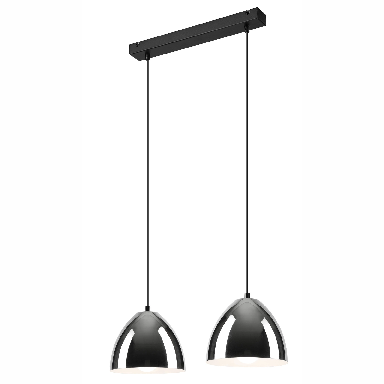 Dies ist eine elegante, 2-flammige moderne Chromlampe, die an schwarzen Drähten hängt. Die Deckenkanäle aus Metall sind pulverbeschichtet und in schwarzer Textur (matt) ausgeführt, während die Schirme außen in glänzendem Chrom und innen in mattem Weiß ausgeführt sind. Kabellängen können angepasst und gekürzt werden.