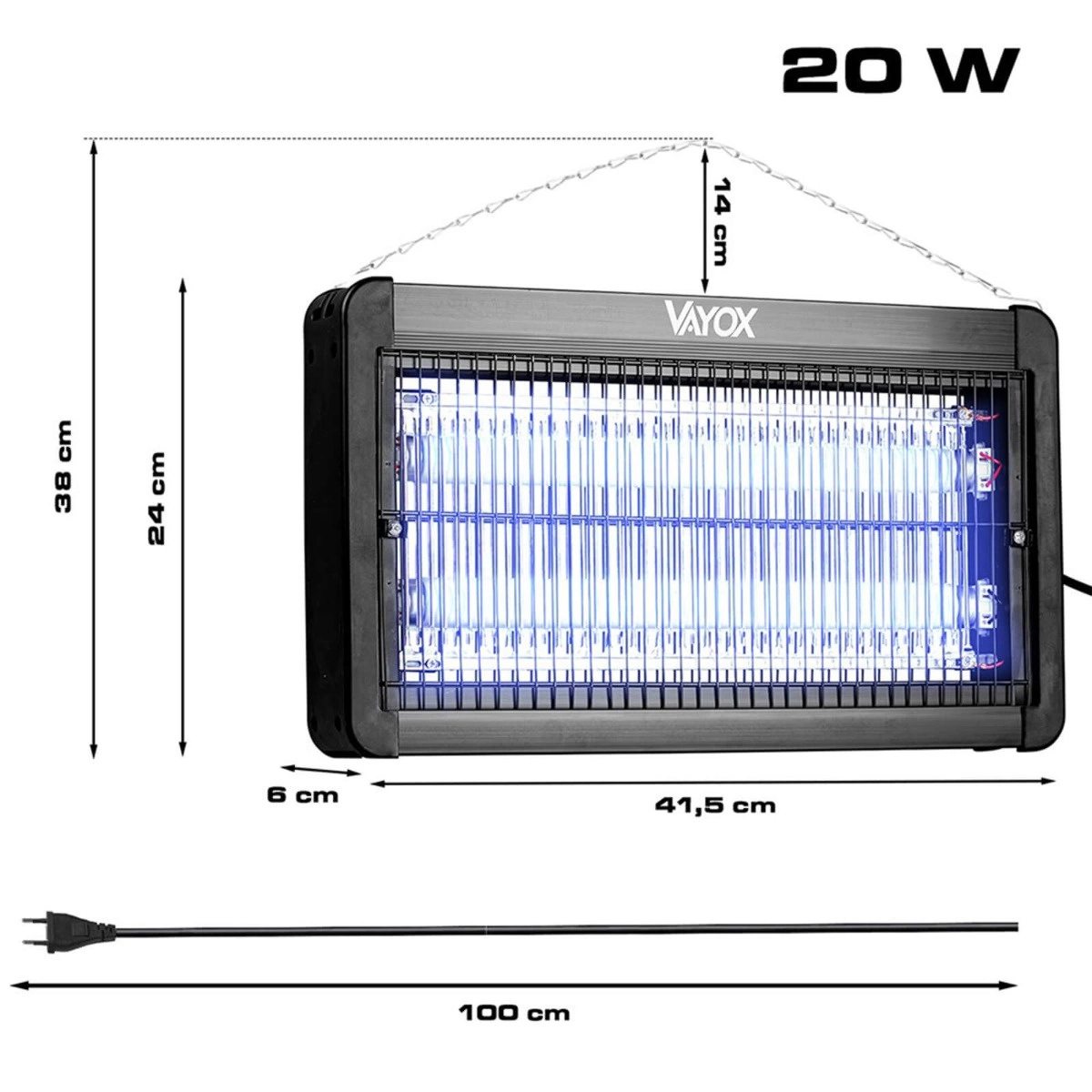 Die VAYOX-Insektizidlampe ist die ideale Lösung für die Bekämpfung von Fliegen, Mücken und anderen Insekten in einem Bereich von bis zu 100 m2. Das netzbetriebene Gerät hat eine Nennleistung von 20 W und kann mit 220-240 V betrieben werden. Sie ist aus haltbarem Kunststoff und Metall gefertigt und bietet ein elegantes schwarzes Design, das sich sowohl in Innen- als auch in Außenbereichen perfekt einfügt.