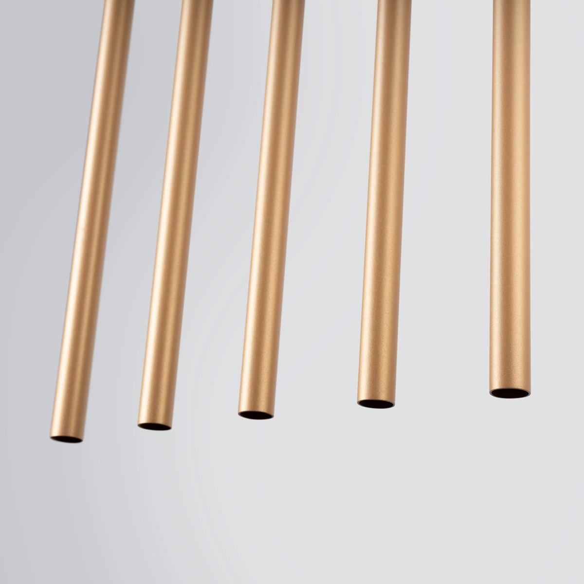 Die goldene Oberfläche verleiht dem Raum einen luxuriösen Touch, während das röhrenförmige Design den Kronleuchter sowohl minimalistisch als auch auffällig macht. Die Leuchte wird mit einer Standardspannung von 230 V betrieben und ist für die Deckenmontage mit einer maximalen Höhe von 50 cm vorgesehen. Er eignet sich ideal für moderne Wohn- und Esszimmer sowie gewerbliche Räume und wird mit Sicherheit zum Mittelpunkt jeder Einrichtung.