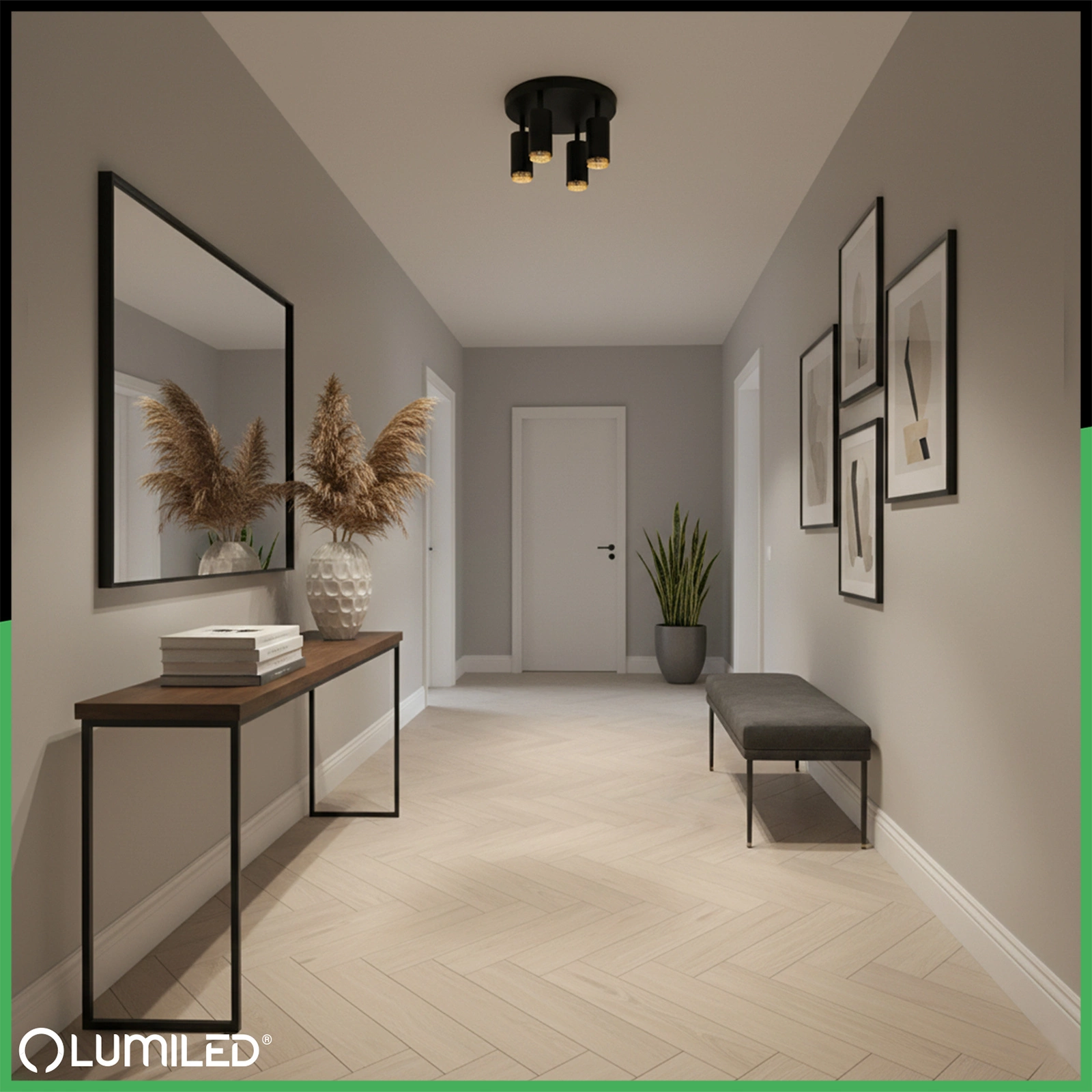 Deckenlampe mit 4 Strahlern aus der ELIGIS-Serie der Marke Lumiled in Schwarz-Gold ist eine elegante und funktionale Lösung für moderne Innenräume. Sie besteht aus hochwertigem Aluminium und vereint Langlebigkeit mit einem ästhetischen Erscheinungsbild. Dieses Modell ist mit einer GU10-Lampenfassung ausgestattet, die in einem stilvollen, goldenen Lampenelement untergebracht ist, was der Lampe einen minimalistischen und dennoch raffinierten Charakter verleiht. Ein weiterer Vorteil der Lampe ist die Möglichkeit, jede GU10-Glühbirne mit einer maximalen Leistung von 12W zu installieren.