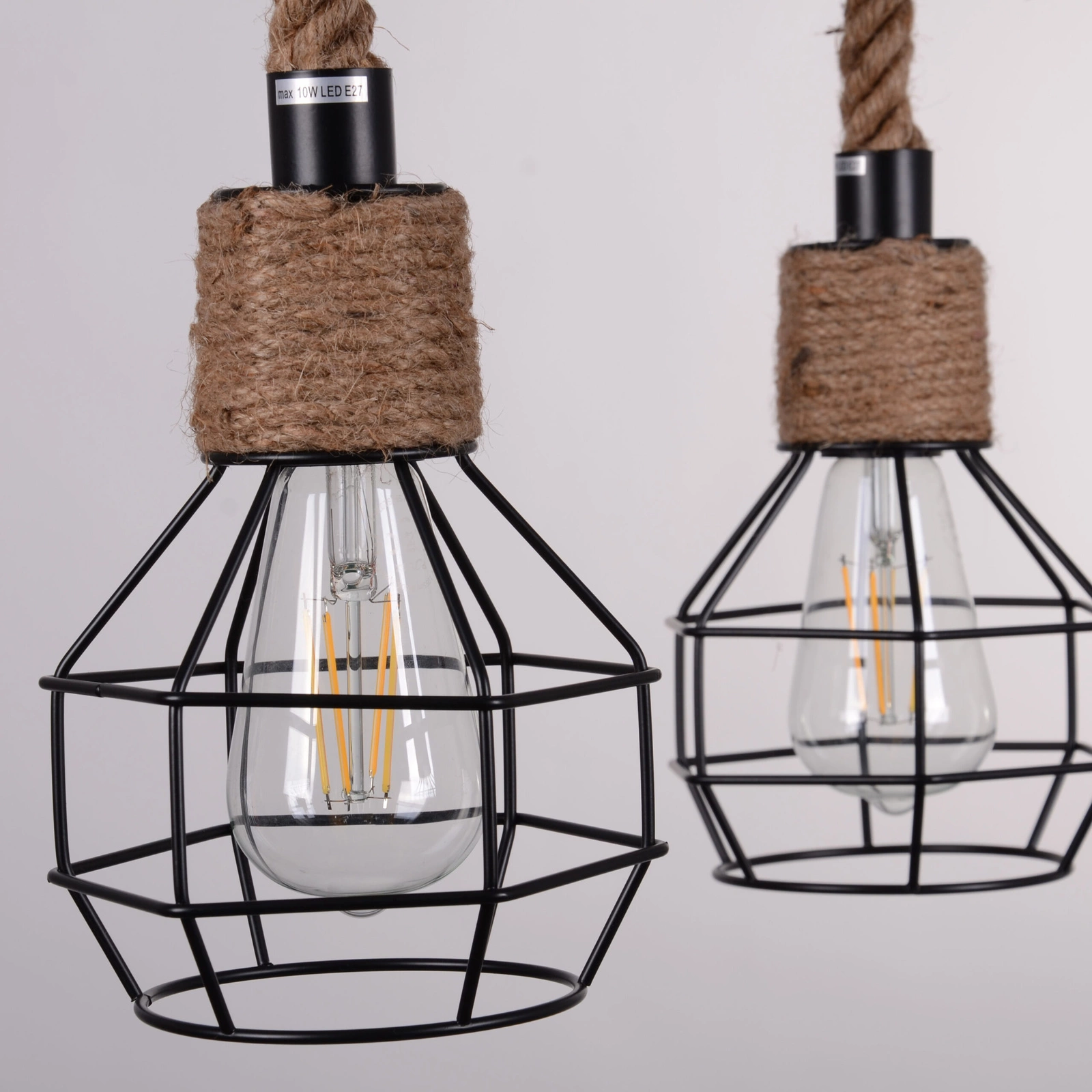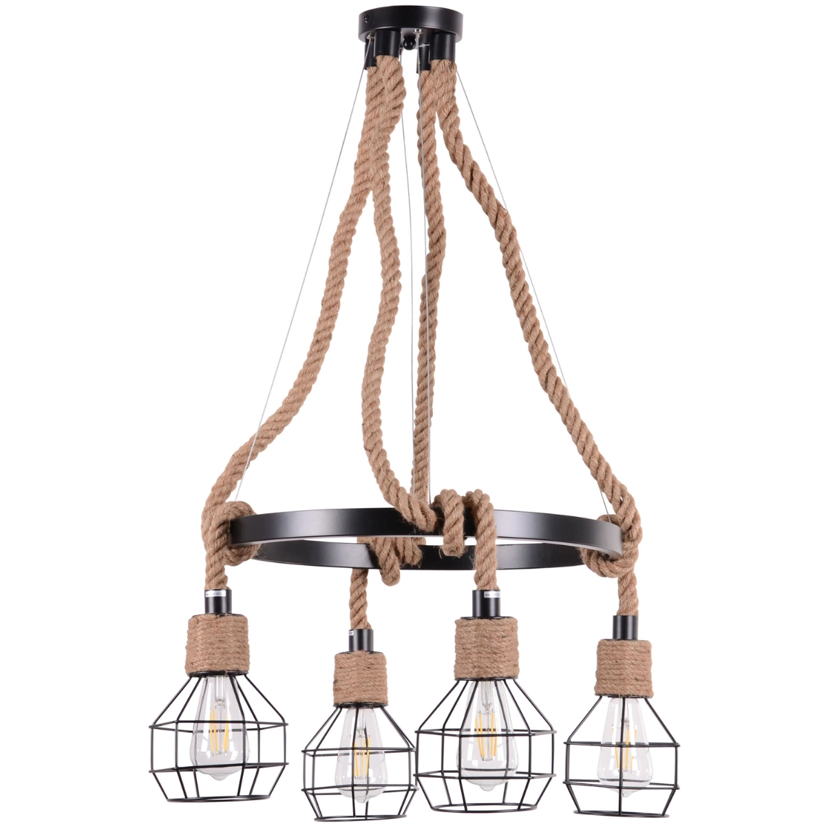Rope Alegra Pendelleuchte von GOLDLUX in Schwarz und Beige im Loft-Stil aus schwarzem Metall und Hanfseil. Er besteht aus einem Metallbügel, an dem vier kleine Drahtschirme aufgehängt sind. Diese Lampenschirme werden an einer Schnur aufgehängt und durch einen Reifen geflochten, wodurch ein interessanter Effekt entsteht, der an alte Beleuchtungslampen erinnert. Die Leuchte hat vier Lichtpunkte, ideal als Hauptlicht in Loft- und Industriestilen. Aufgrund der freiliegenden Lichtquelle, empfehlen wir für die Leuchte die dekorativen Glühbirnen der Serie FILAMENT für ein exquisites Finish und einen dekorativen Touch. Diese Lampe ist das ideale Produkt für alle, die ihre Wohnung mit einem einzigartigen und unkonventionellen Accessoire schmücken möchten, das die originelle Inneneinrichtung unterstreicht. An einem zentralen Ort aufgehängt, ist es eine auffällige Dekoration.